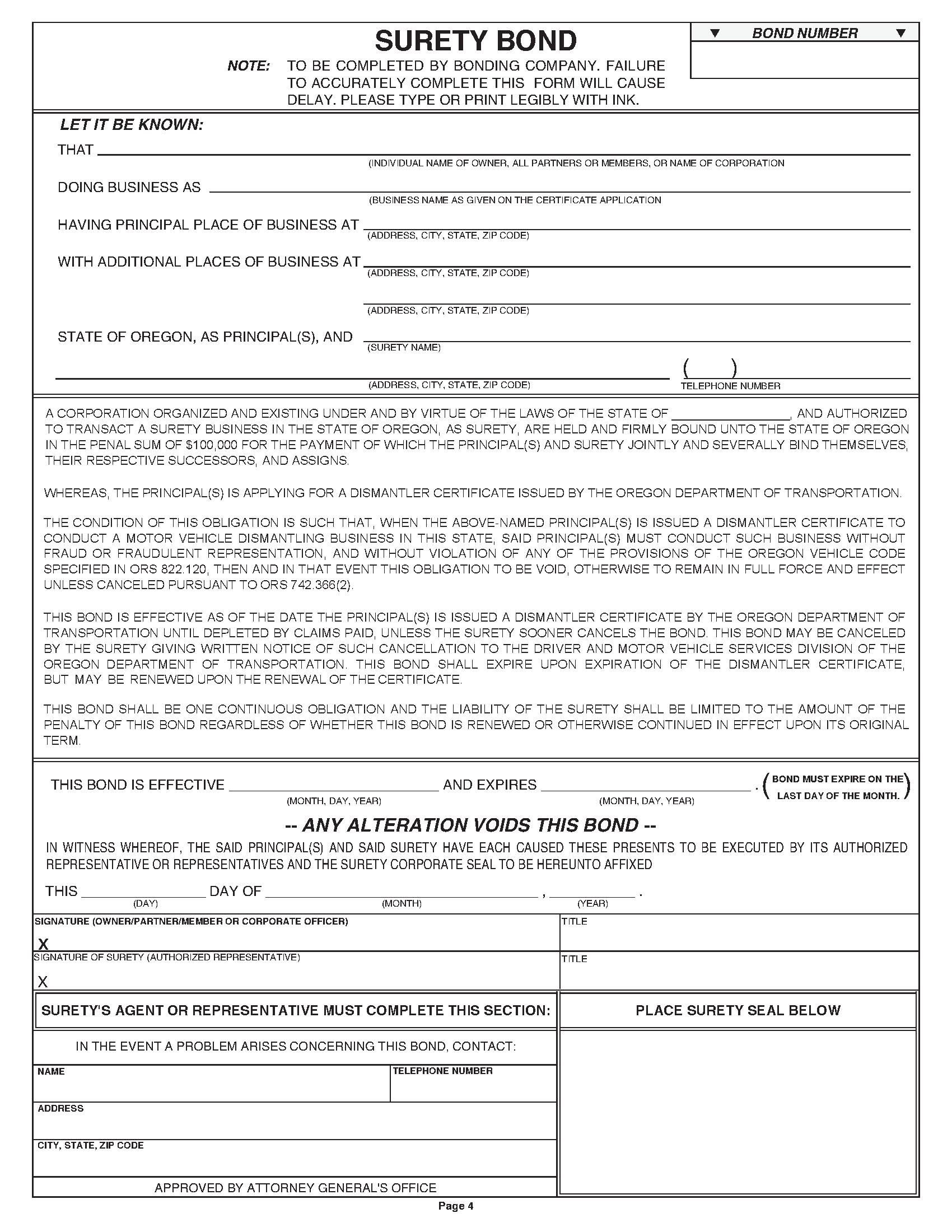 The Oregon Motor Vehicle Dismantler Bond starts at $100 plus shipping costs and fees. Fill out the form to buy your bond instantly!