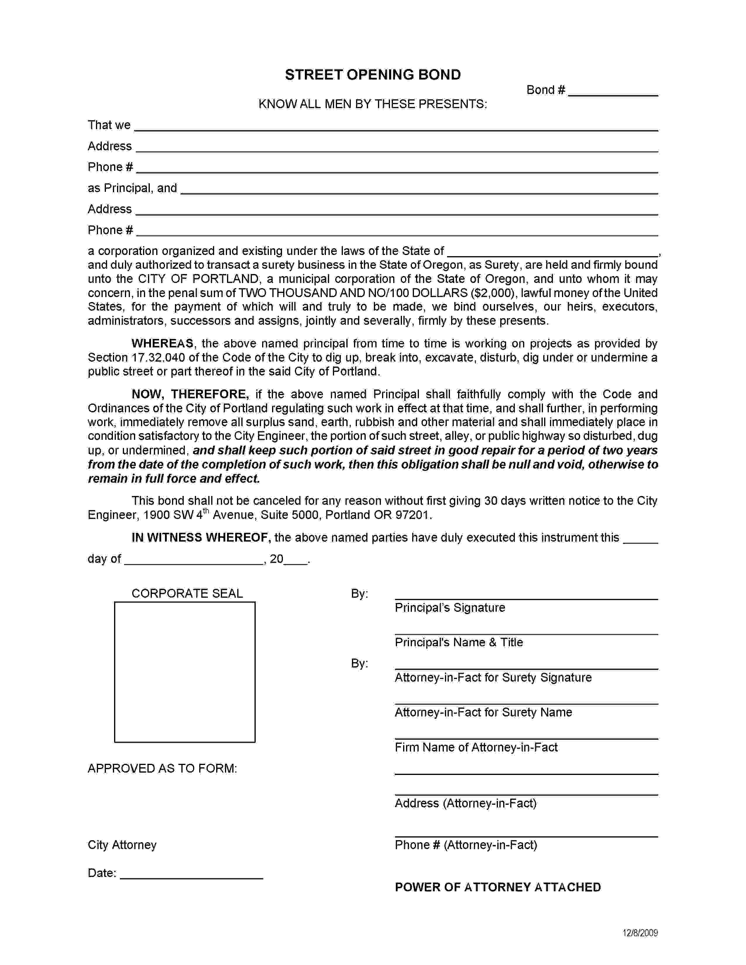 The Oregon City of Portland Street Opening Bond starts at $100 plus shipping costs and fees. Fill out the form to buy your bond instantly!