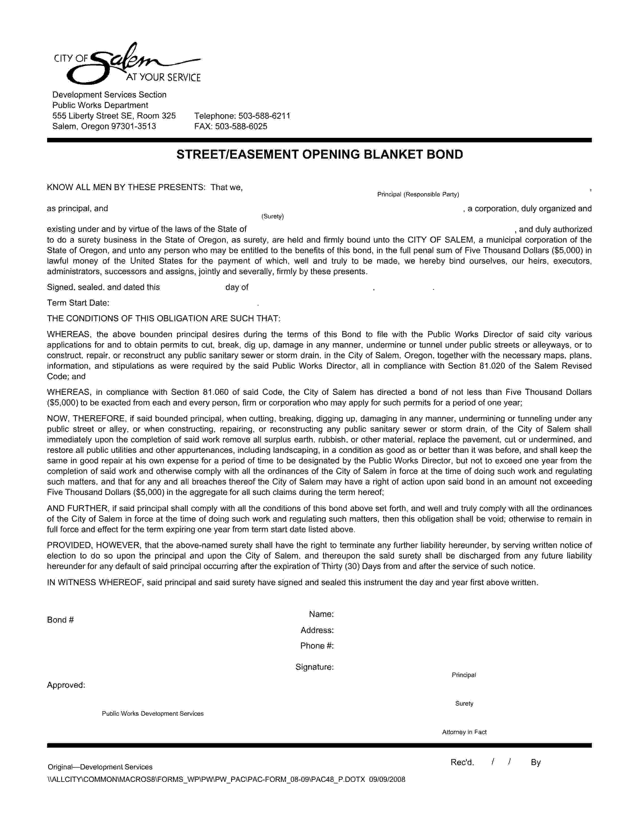 The Oregon City of Salem Street/Easement Opening Blanket Bond starts at $100 plus shipping costs and fees. Fill out the form to buy your bond instantly!