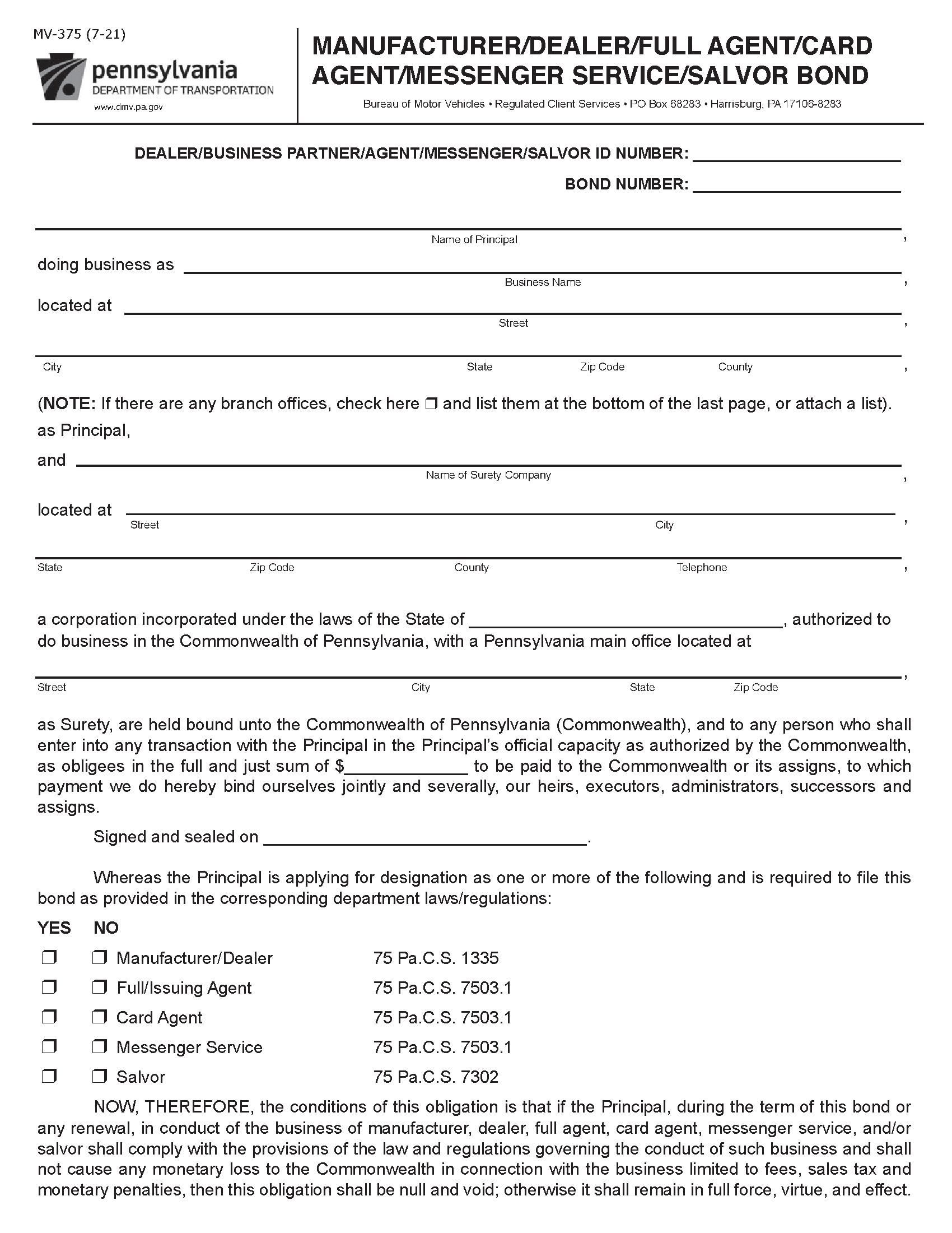 Motor vehicle dealers applying for a Pennsylvania dealership license must obtain a Motor Vehicle Dealership License Bond. This bond is required for various motor vehicle license types, including Manufacturer/Dealer, Full/Issuing Agent, Card Agent, Messenger Service, and Salvor licenses.