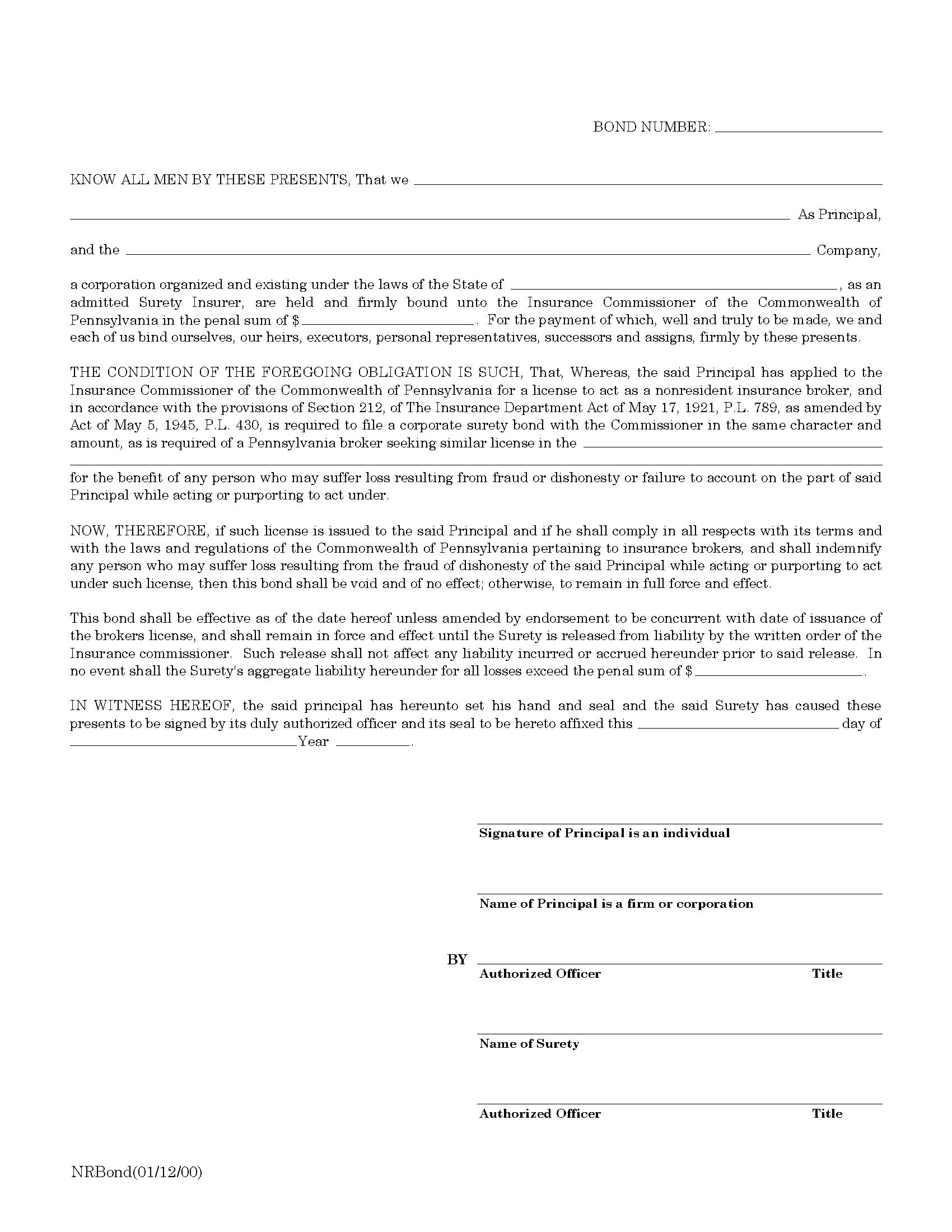 Commonwealth of Pennsylvania Non-Resident Insurance Broker Bond