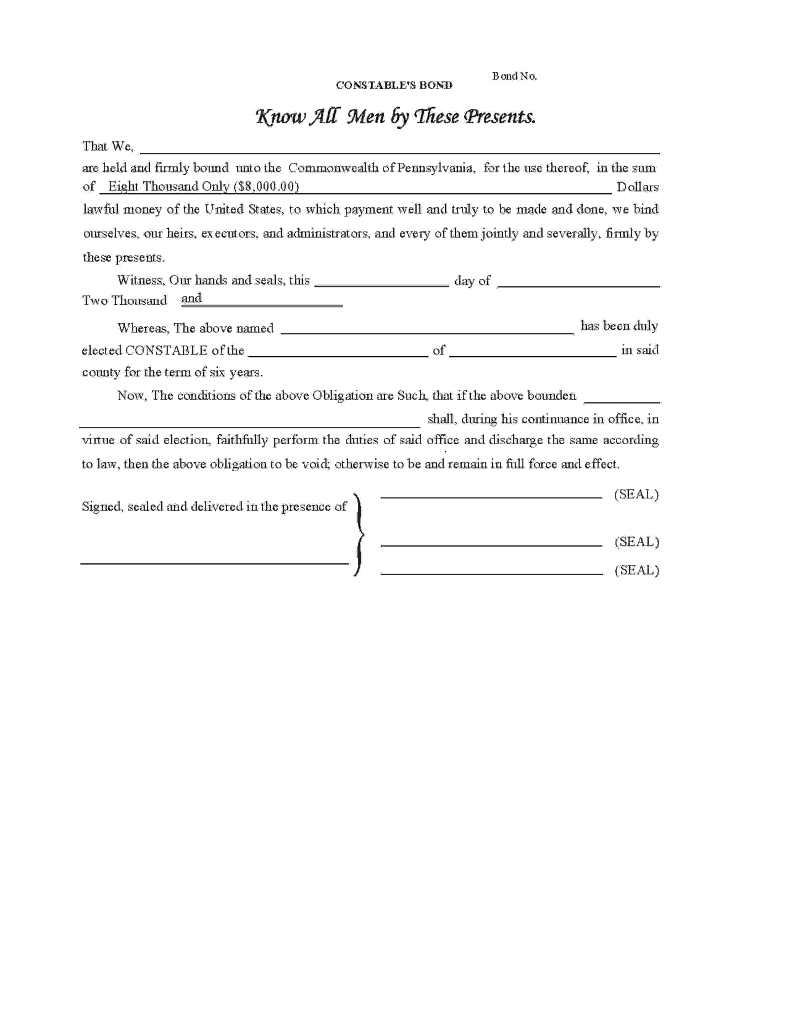 The Pennsylvania Commonwealth of Pennsylvania - Westmoreland County Constable Bond starts at $475 plus shipping costs and fees. Fill out the form to buy your bond instantly!