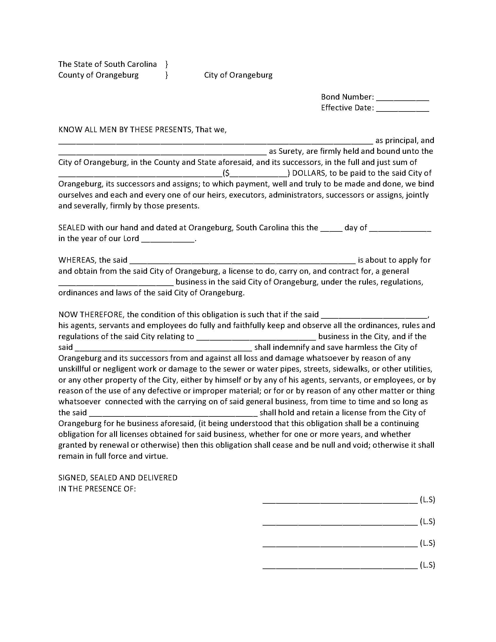 The South Carolina City of Orangeburg Contractor's License Bond starts at $100 plus shipping costs and fees. Fill out the form to buy your bond instantly!