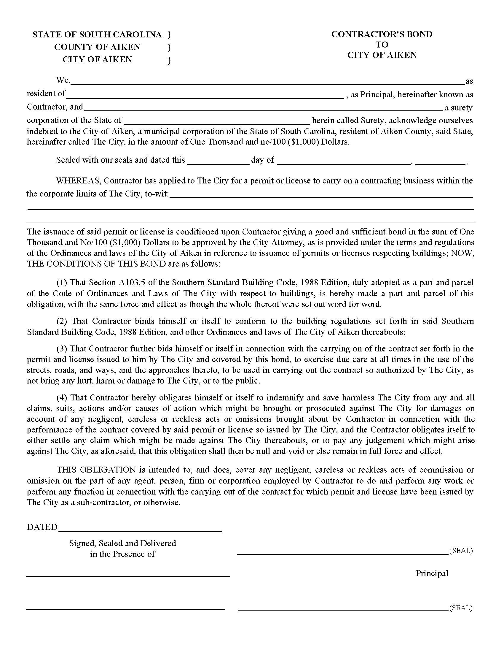 The South Carolina City of Aiken Contractor Bond starts at $100 plus shipping costs and fees. Fill out the form to buy your bond instantly!