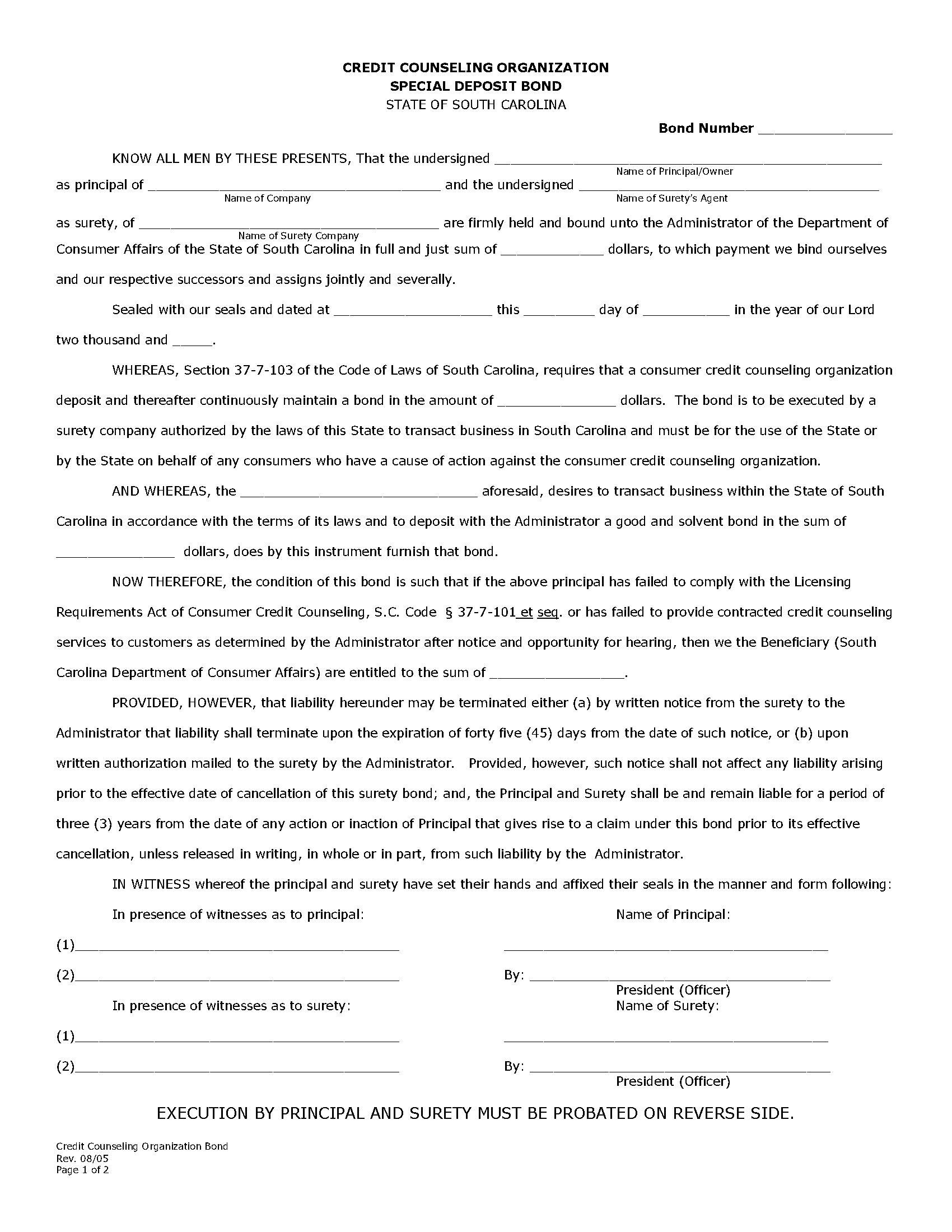 The South Carolina Credit Counseling Organization Bond starts at $250 plus shipping costs and fees. Fill out the form to buy your bond instantly!