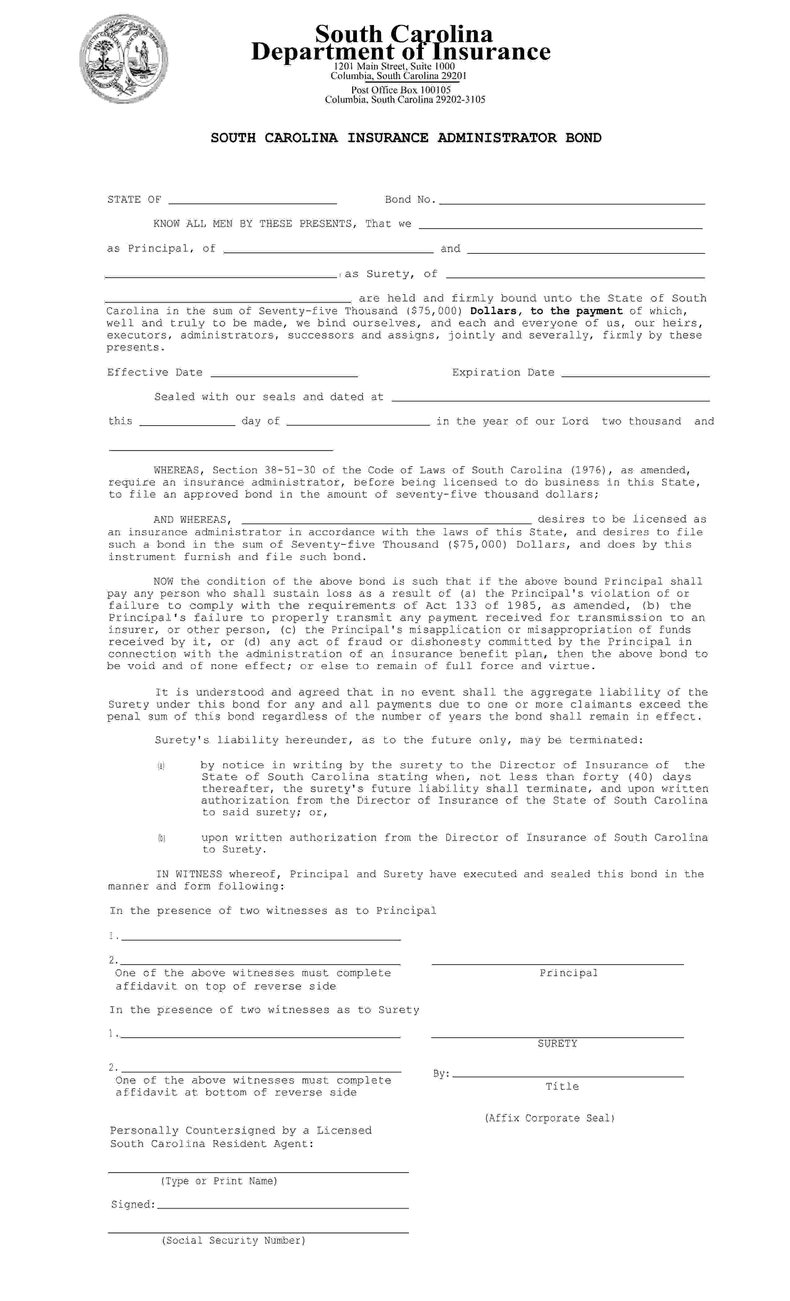 The South Carolina Insurance Administrator Bond starts at $100 plus shipping costs and fees. Fill out the form to buy your bond instantly!