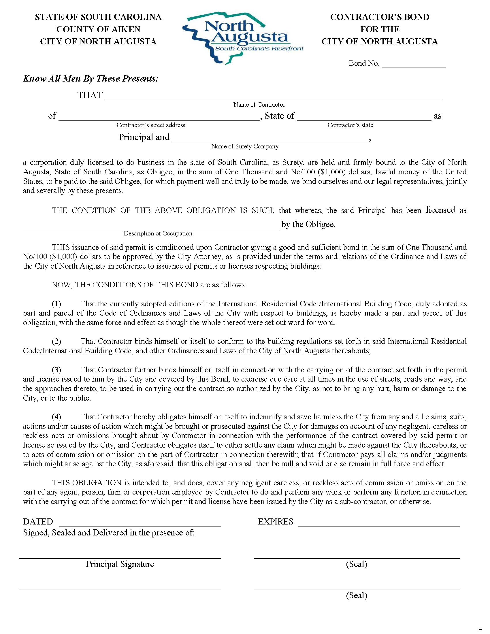 The South Carolina City of North Augusta Contractor's License Bond starts at $100 plus shipping costs and fees. Fill out the form to buy your bond instantly!