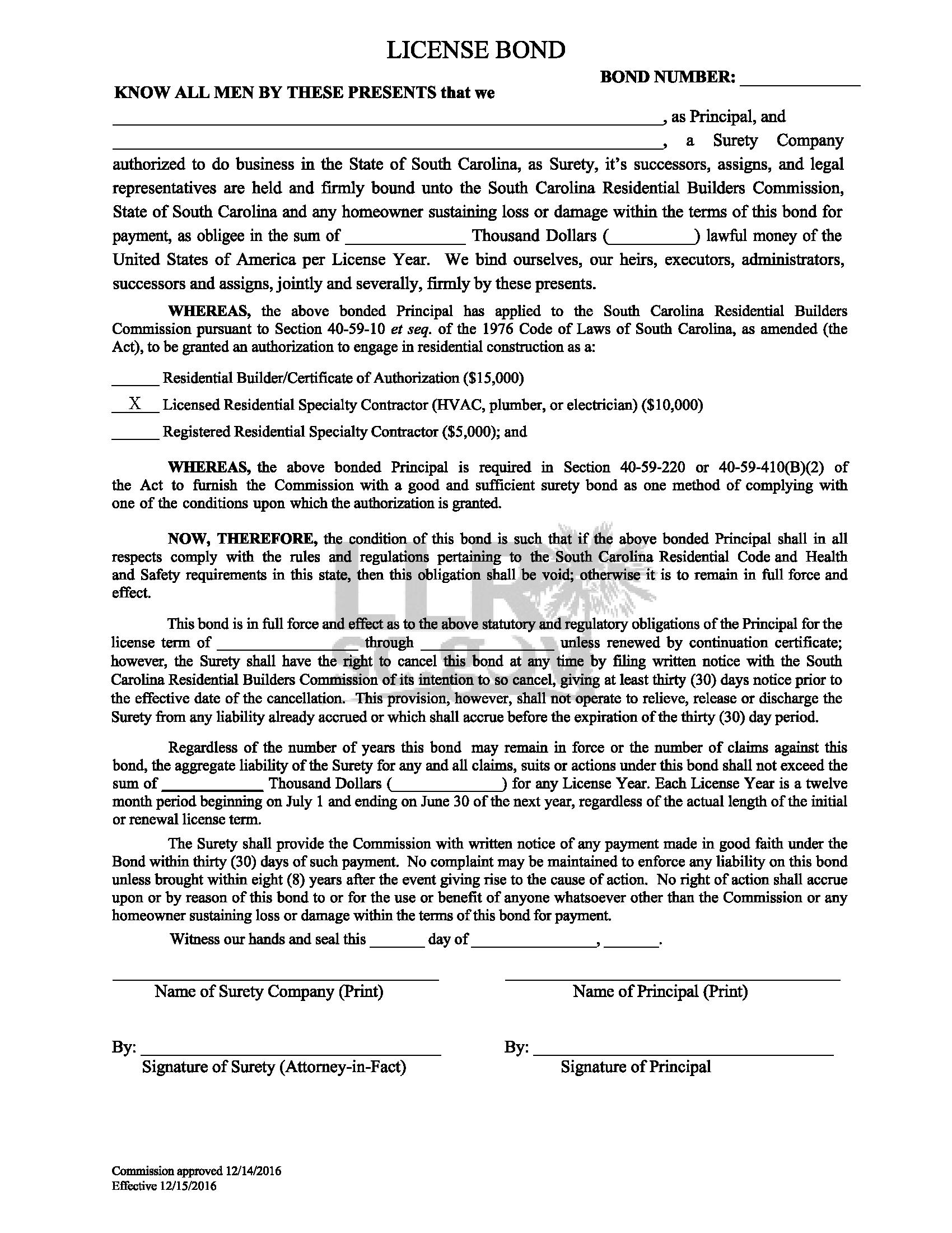 Keep in mind that the South Carolina Licensed Residential Specialty Contractor Bond differs from other bonds like the South Carolina Residential Builder Bond/Certificate of Authorization (for Residential Builders; $15,000) and the South Carolina Registered Residential Specialty Contractor Bond ($5,000).