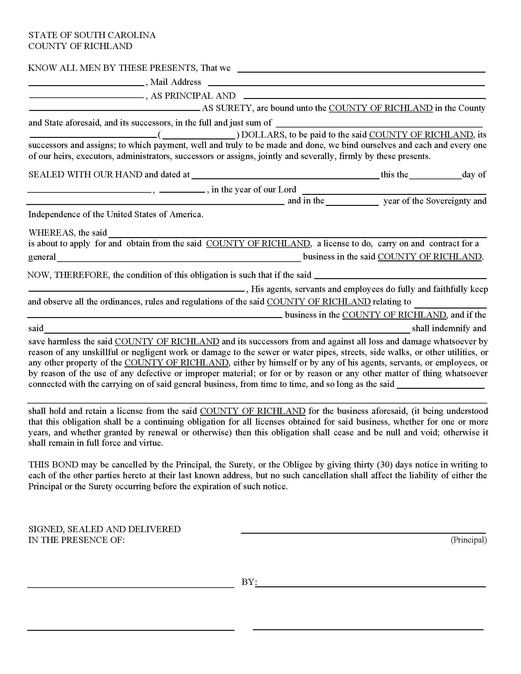 The South Carolina County of Richland Richland County License and Permit Bond starts at $100 plus shipping costs and fees. Fill out the form to buy your bond instantly!