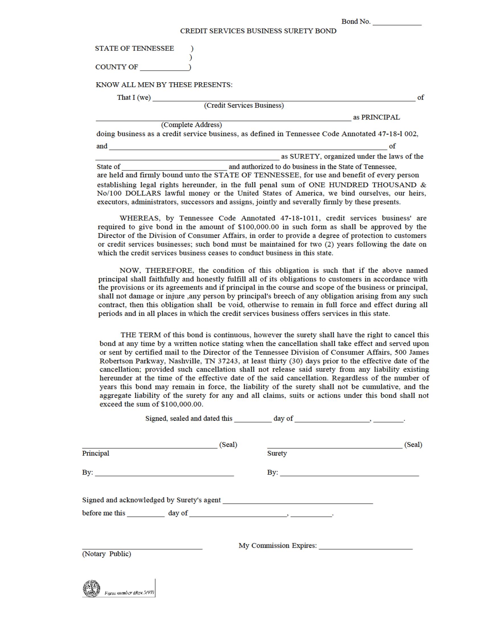 The Tennessee Credit Services Business Bond starts at $1000 plus shipping costs and fees. Fill out the form to buy your bond instantly!