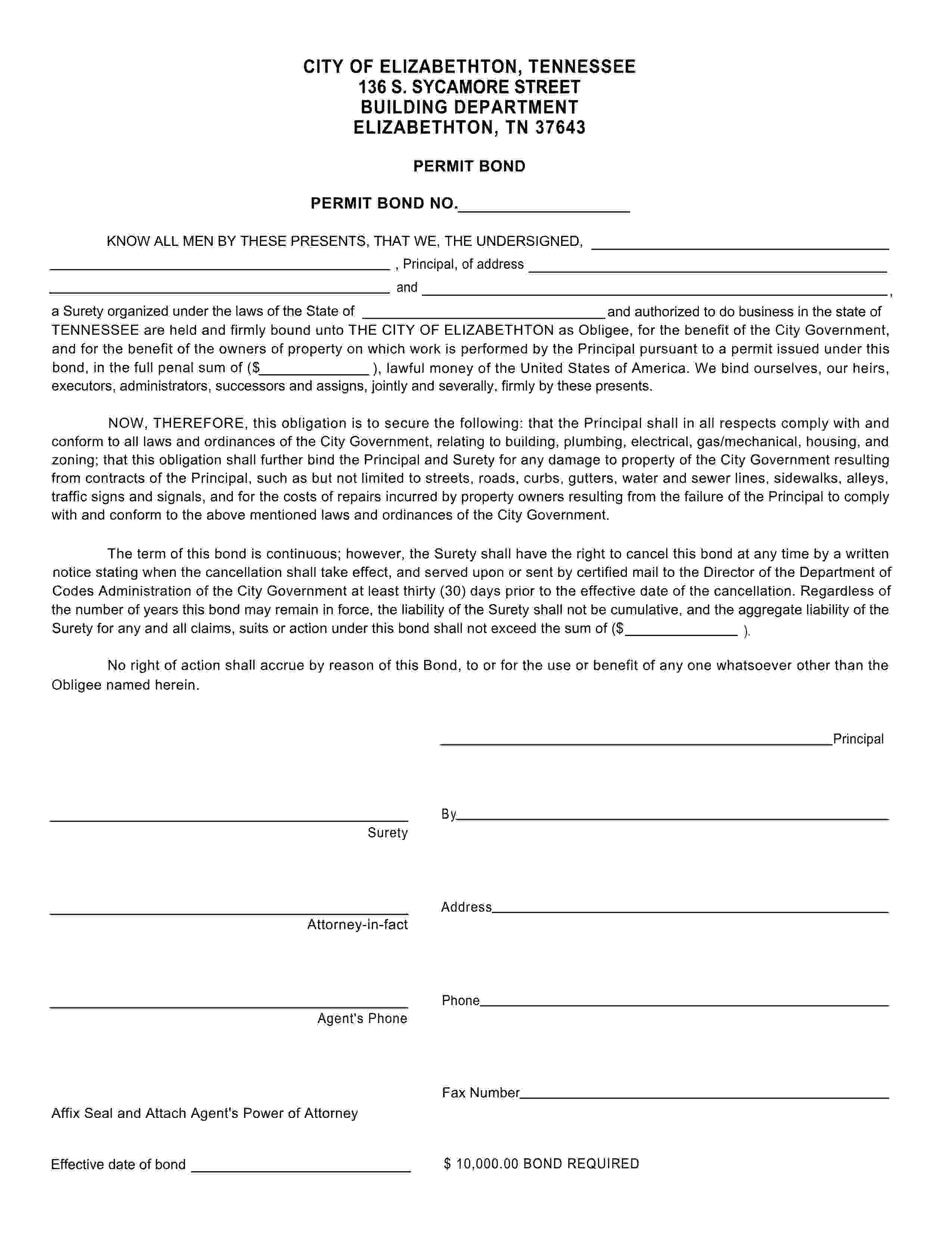 The Tennessee Director of the Department of Codes Administration Elizabethton - City Contractor's Permit Bond starts at $100 plus shipping costs and fees. Fill out the form to buy your bond instantly!