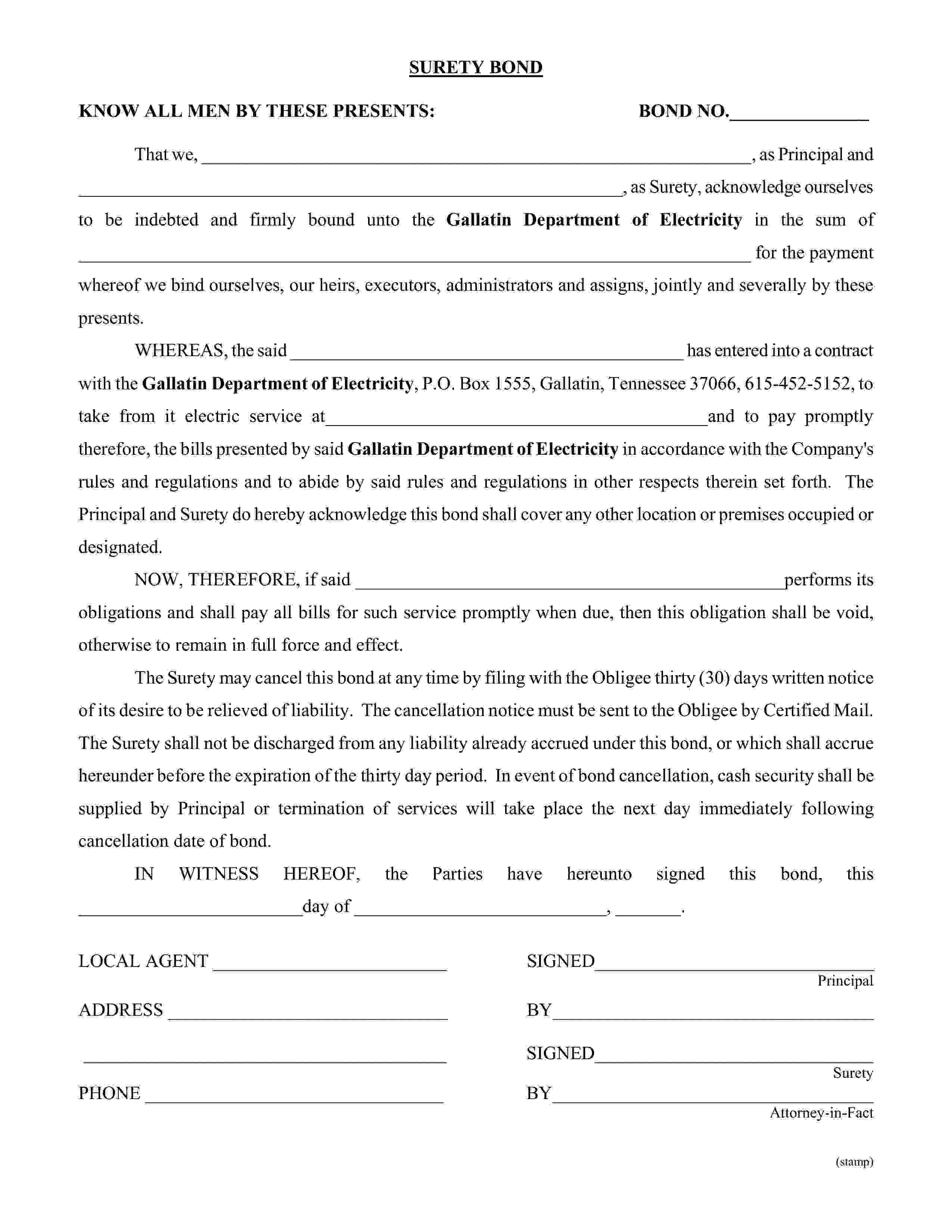 The Tennessee Gallatin Department of Electricity Utility Deposit Bond starts at $100 plus shipping costs and fees. Fill out the form to buy your bond instantly!