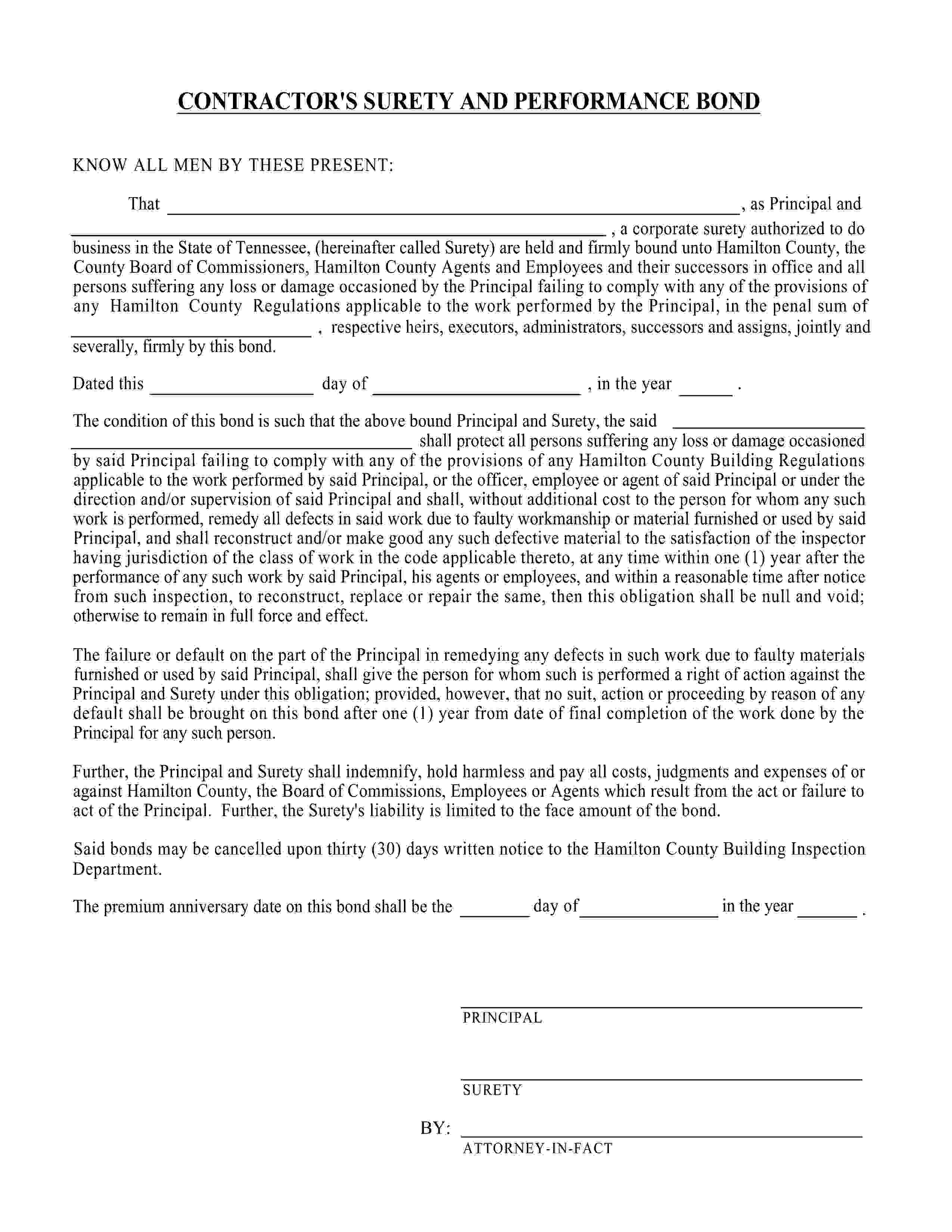 Hamilton County Contractor's Surety and Performance Bond