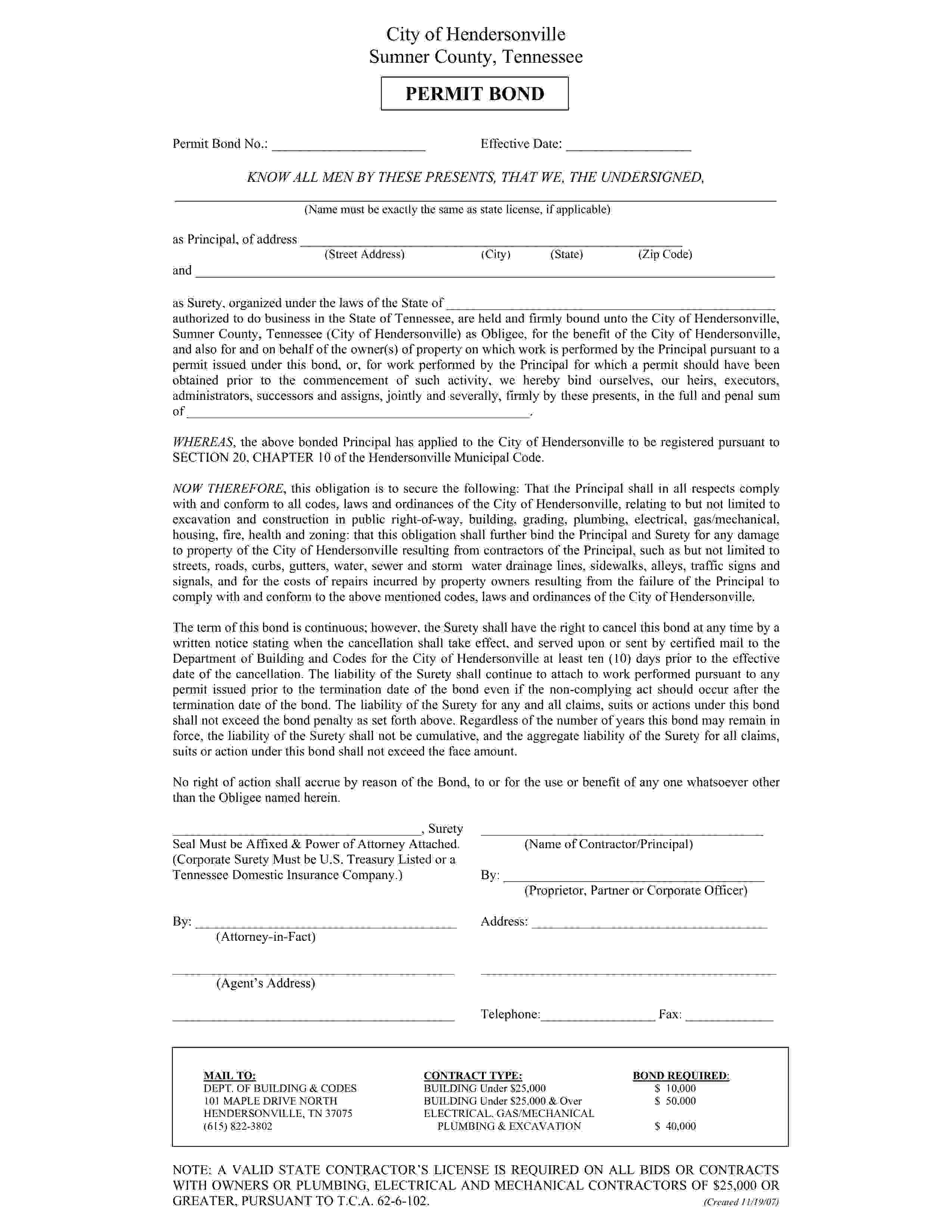 The Tennessee Department of Building & Codes Hendersonville Electrical, Gas, Mechanical, Plumbing, Excavation Pool Bond starts at $400 plus shipping costs and fees. Fill out the form to buy your bond instantly!