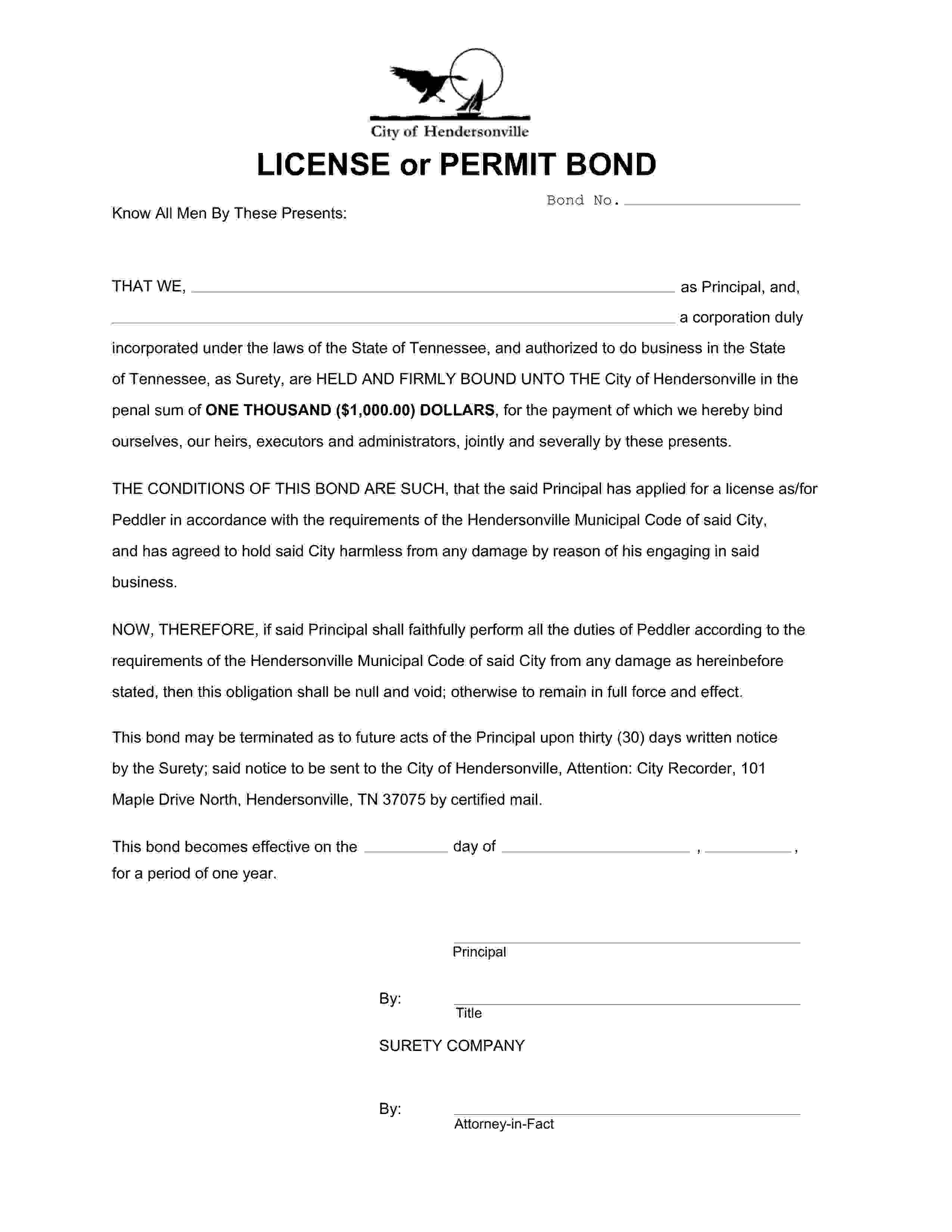 The Tennessee City of Hendersonville Peddler Permit Bond starts at $100 plus shipping costs and fees. Fill out the form to buy your bond instantly!
