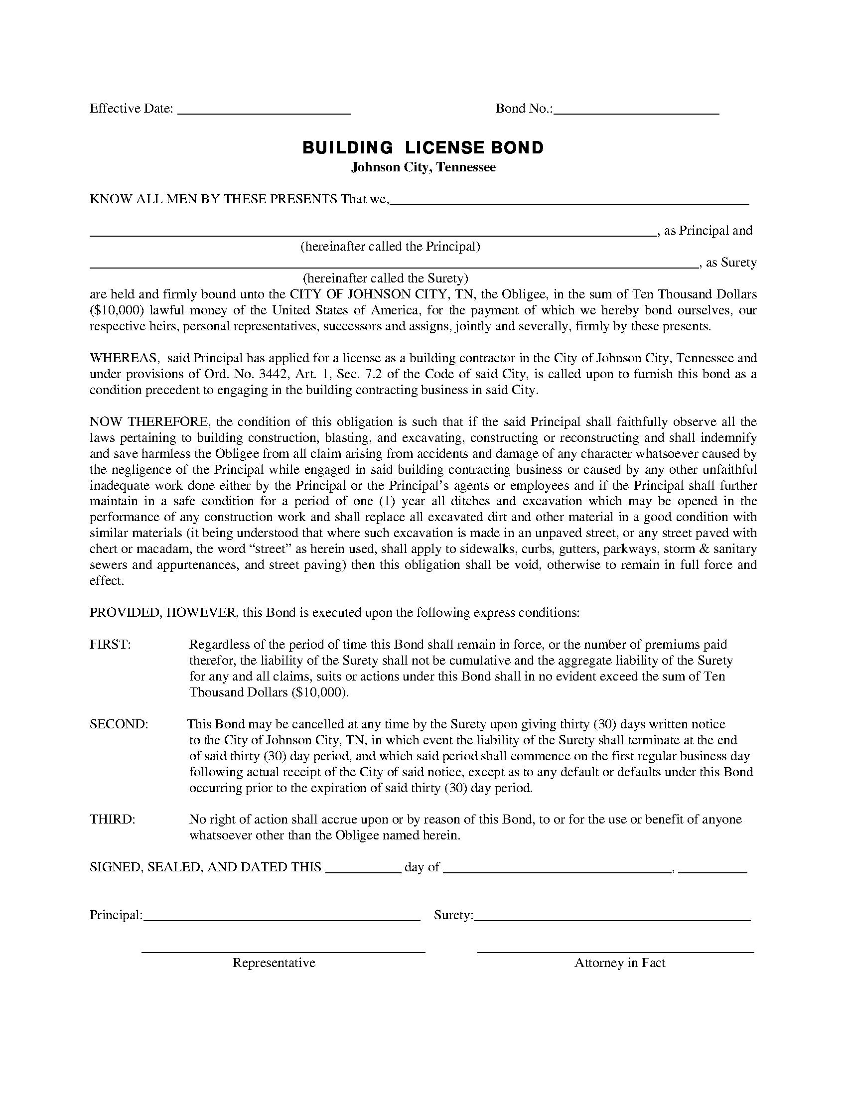 The Tennessee City of Johnson City Building License Bond starts at $100 plus shipping costs and fees. Fill out the form to buy your bond instantly!