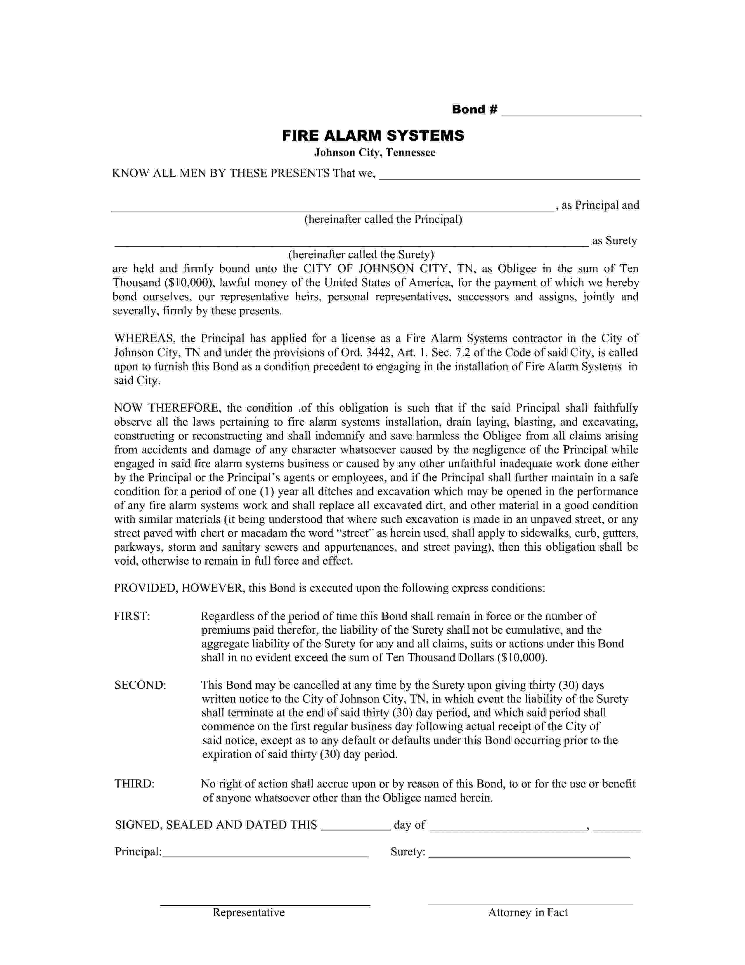 The Tennessee City of Johnson City Fire Alarm Systems Bond starts at $100 plus shipping costs and fees. Fill out the form to buy your bond instantly!