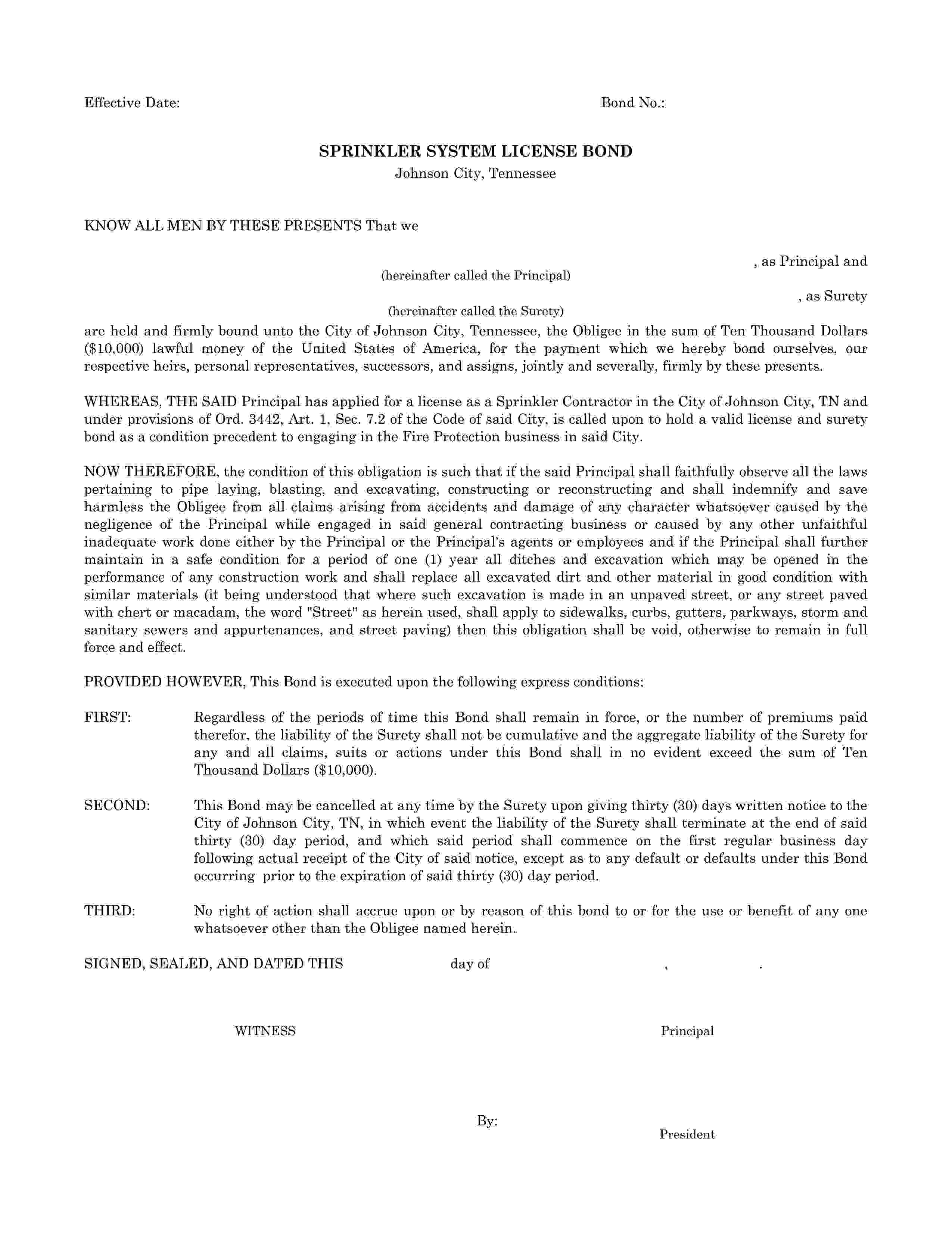 The Tennessee City of Johnson City Fire Sprinkler License Bond starts at $100 plus shipping costs and fees. Fill out the form to buy your bond instantly!