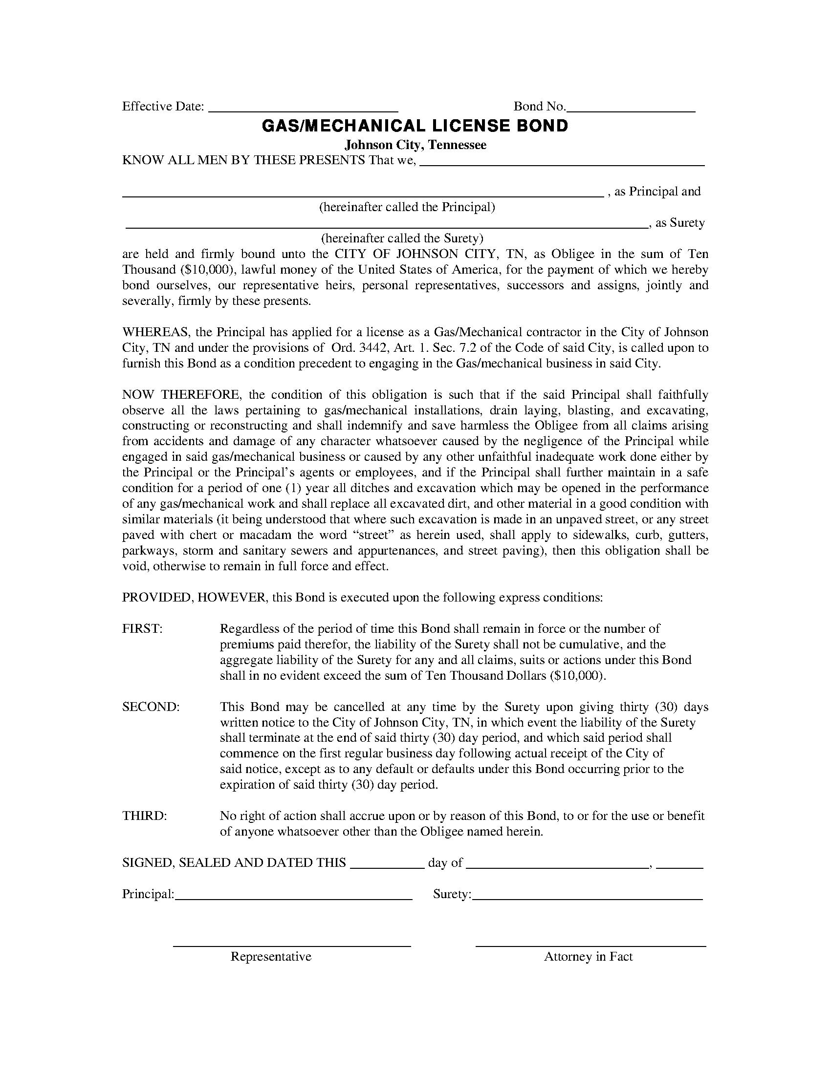City of Johnson City Gas/Mechanical License Bond