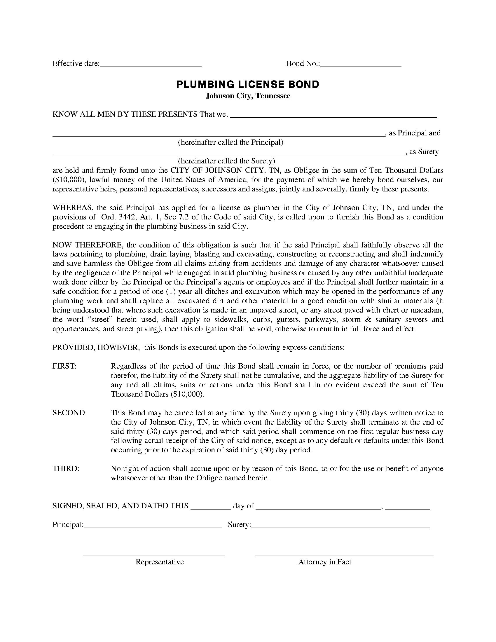The Tennessee City of Johnson City Plumbing License Bond starts at $100 plus shipping costs and fees. Fill out the form to buy your bond instantly!