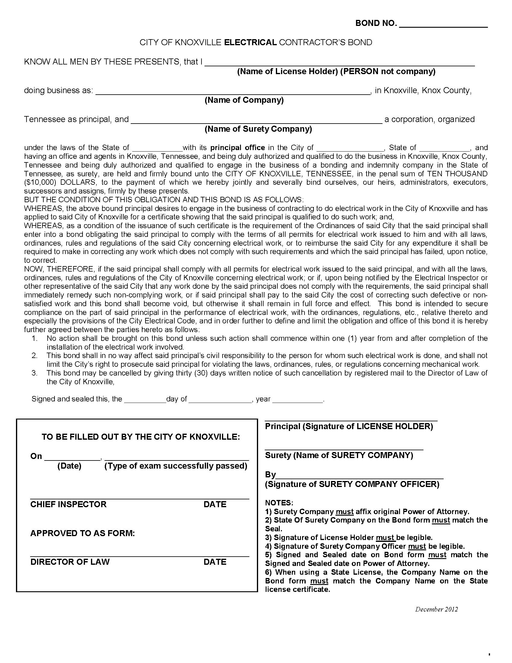 The City of Knoxville Electrical Contractor Bond starts at $100 plus shipping costs and fees. Fill out the form to buy your bond instantly!
