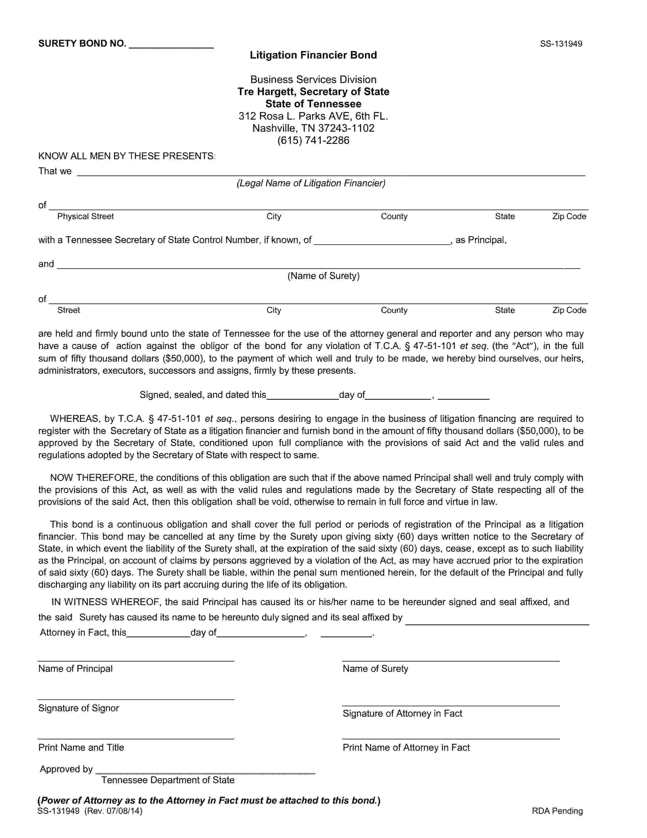 The Tennessee Litigation Financier Bond starts at $500 plus shipping costs and fees. Fill out the form to buy your bond instantly!