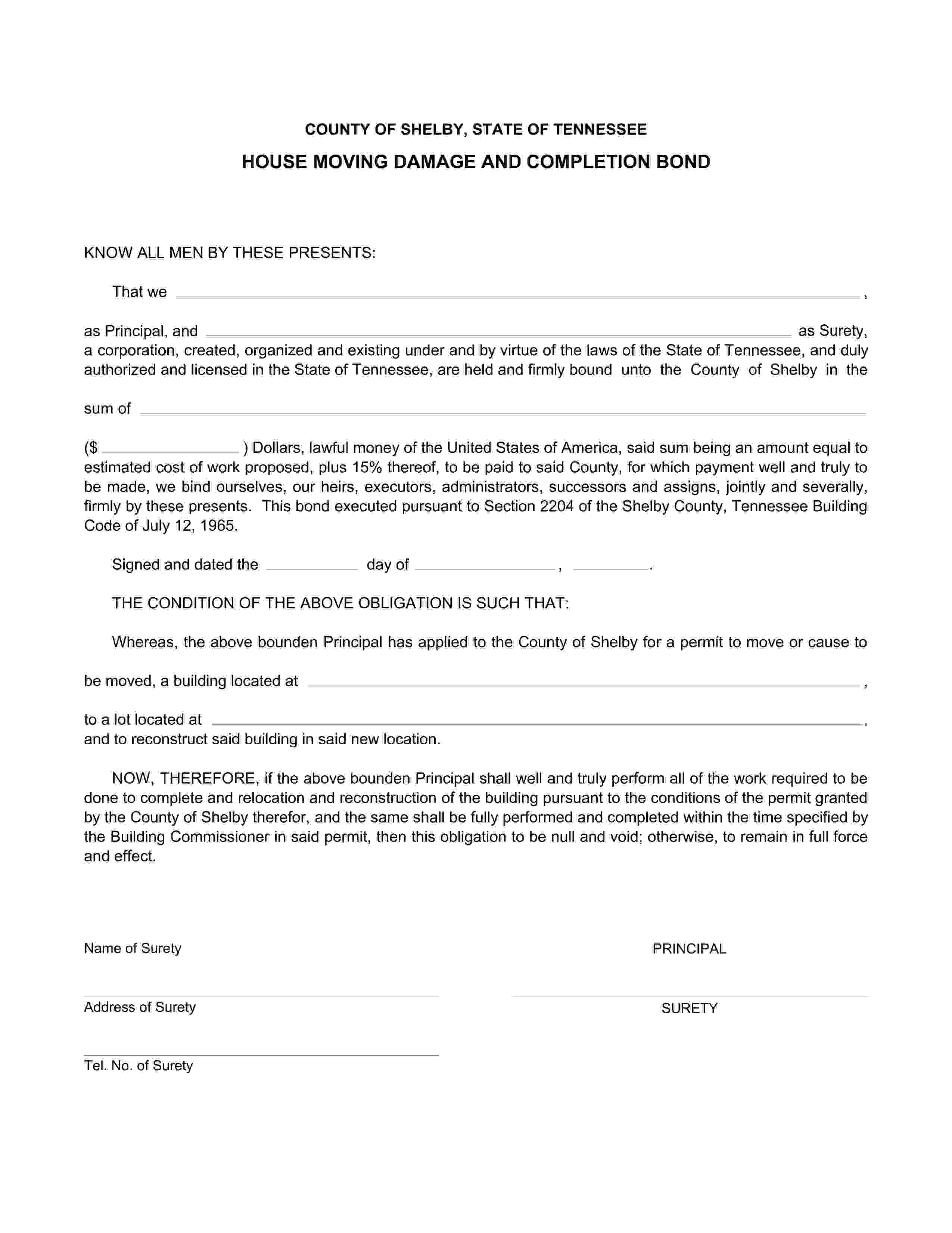 The Tennessee Shelby County House Moving Damage and Completion Bond starts at $100 plus shipping costs and fees. Fill out the form to buy your bond instantly!