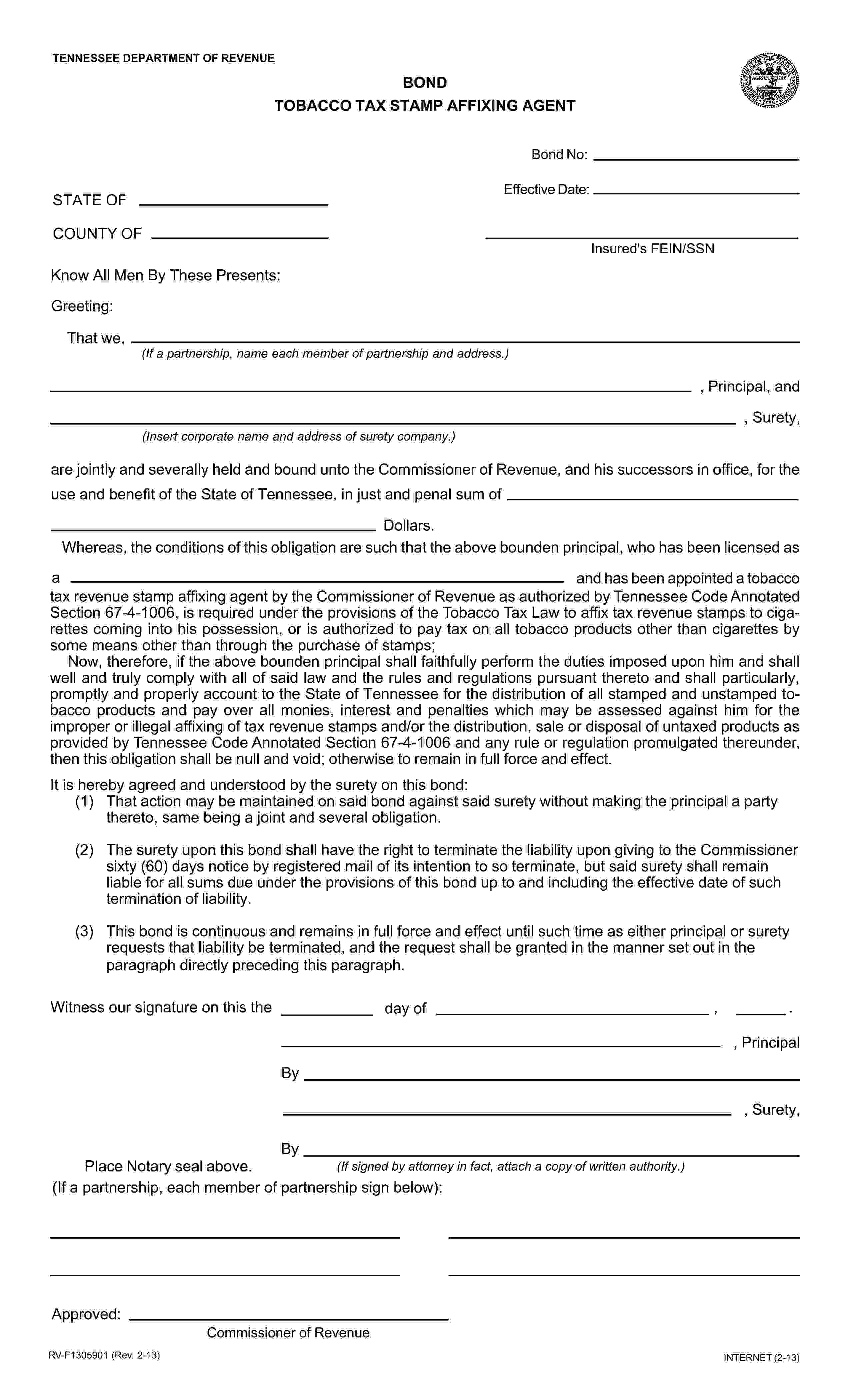 State of Tennessee Tobacco Tax Stamp Affixing Agent Bond