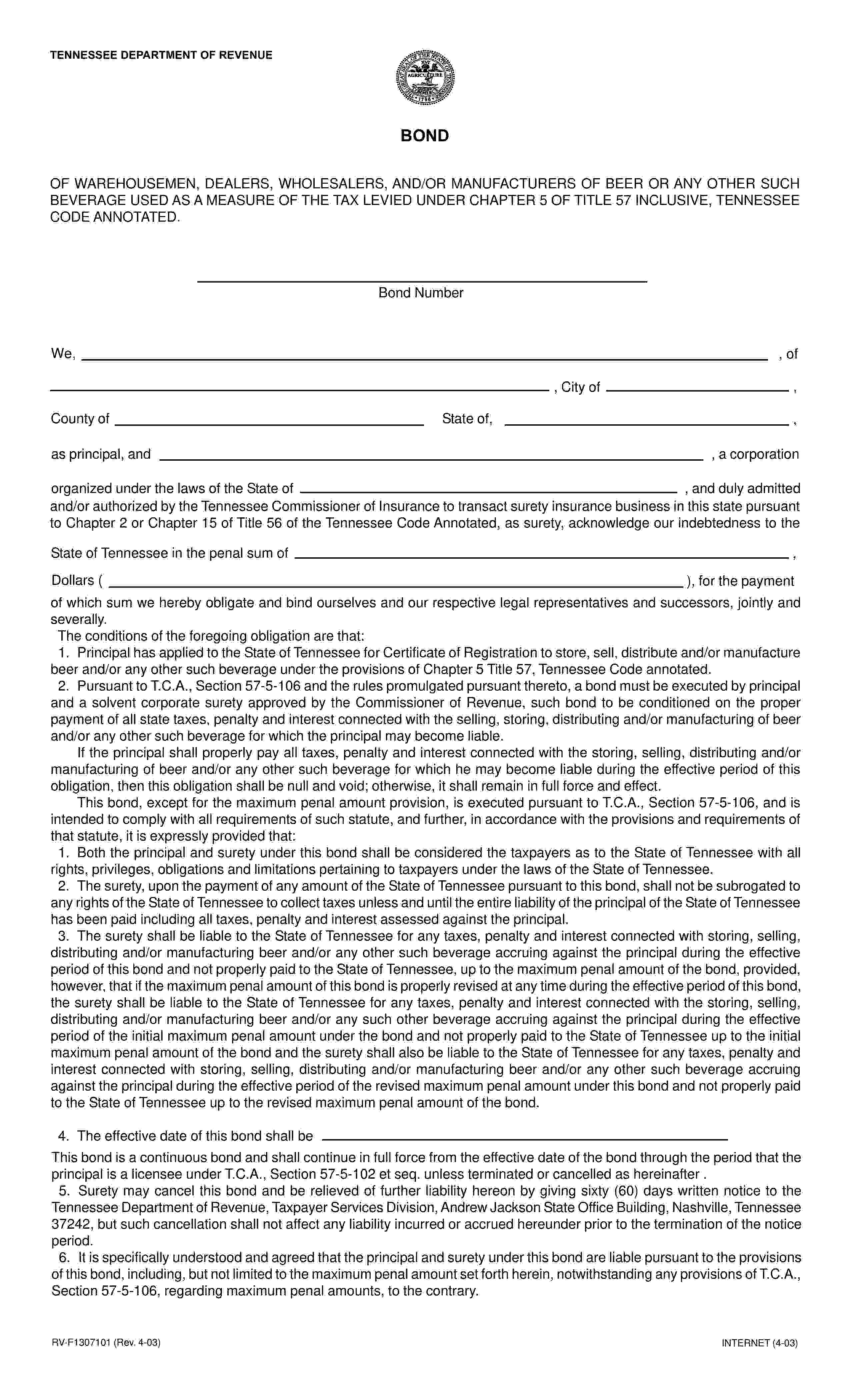 State of Tennessee Warehousemen, Dealer, Wholesaler, Manufacturer, Distributor Beer Tax - Corporation or LLC Bond