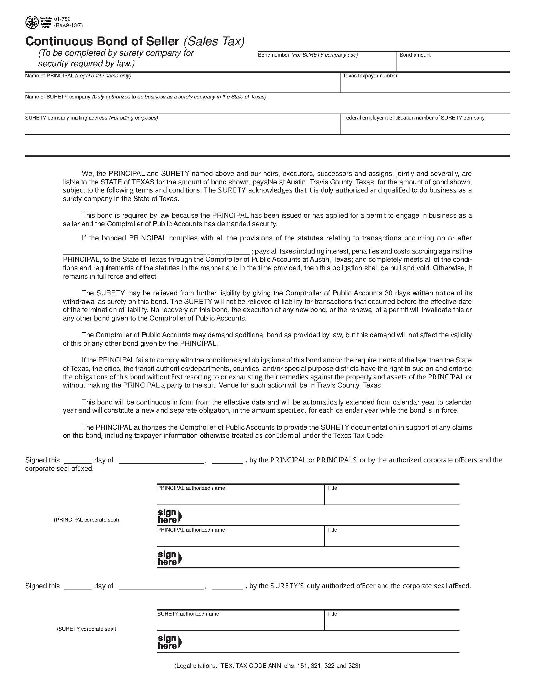 State of Texas Continuous Bond of Seller (Sales Tax)