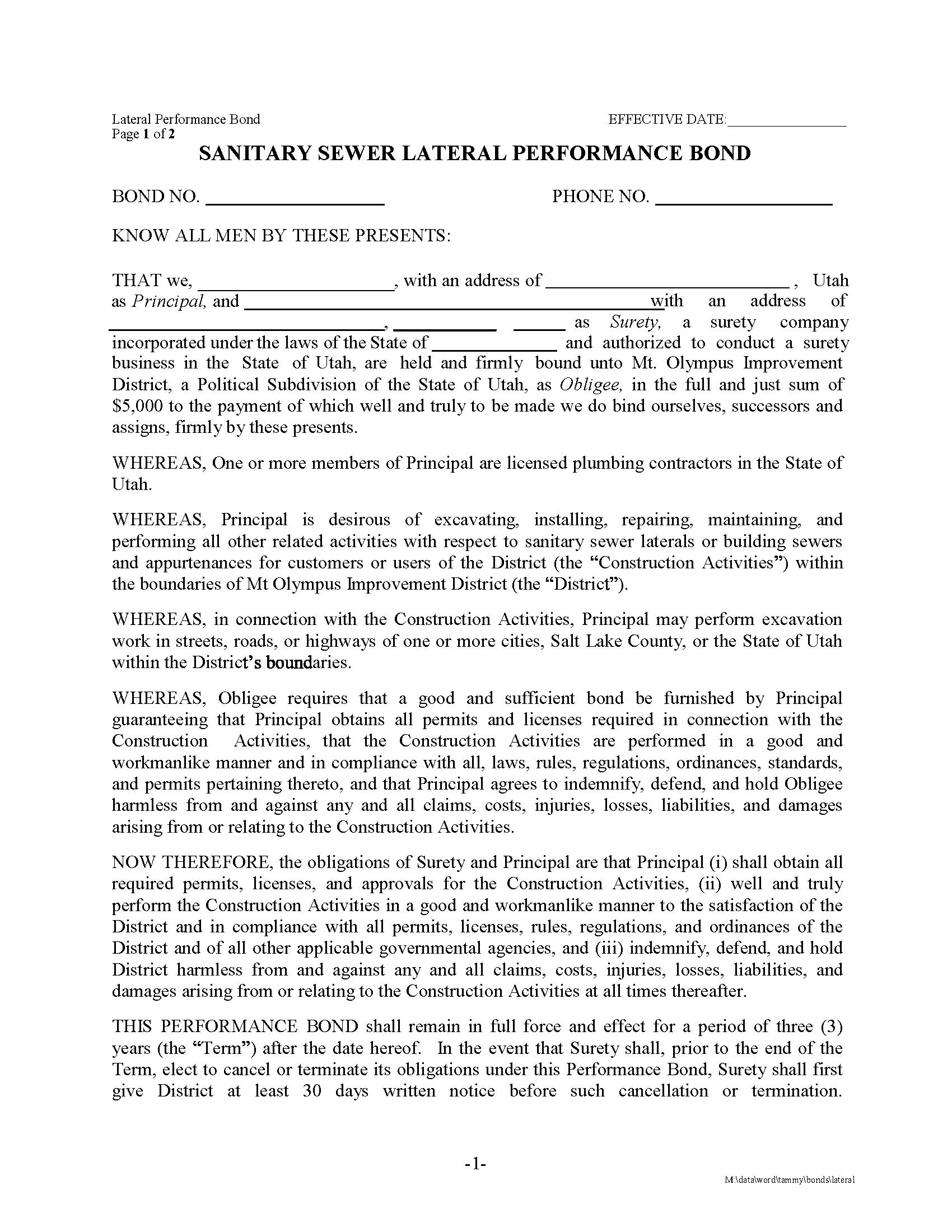 The Utah Mt. Olympus Improvement District, Salt Lake County, State of Utah Sanitary Sewer Lateral Performance Bond Bond starts at $250 plus shipping costs and fees. Fill out the form to buy your bond instantly!