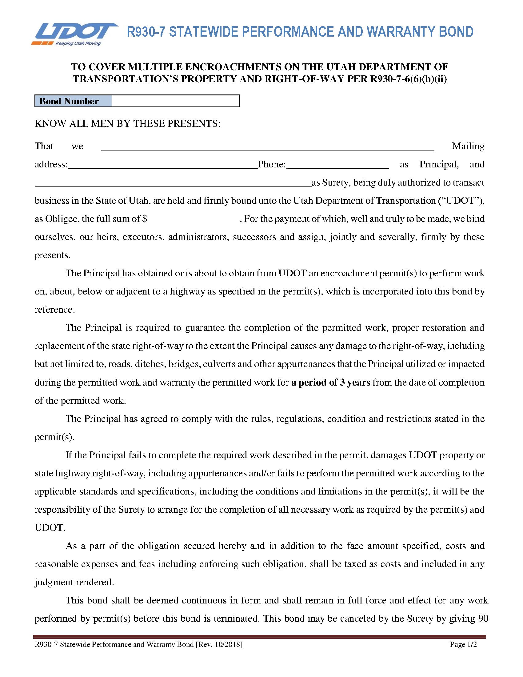 Utah Department of Transportation Multiple Encroachments on Property and Right-of-Way (R930-7) Bond