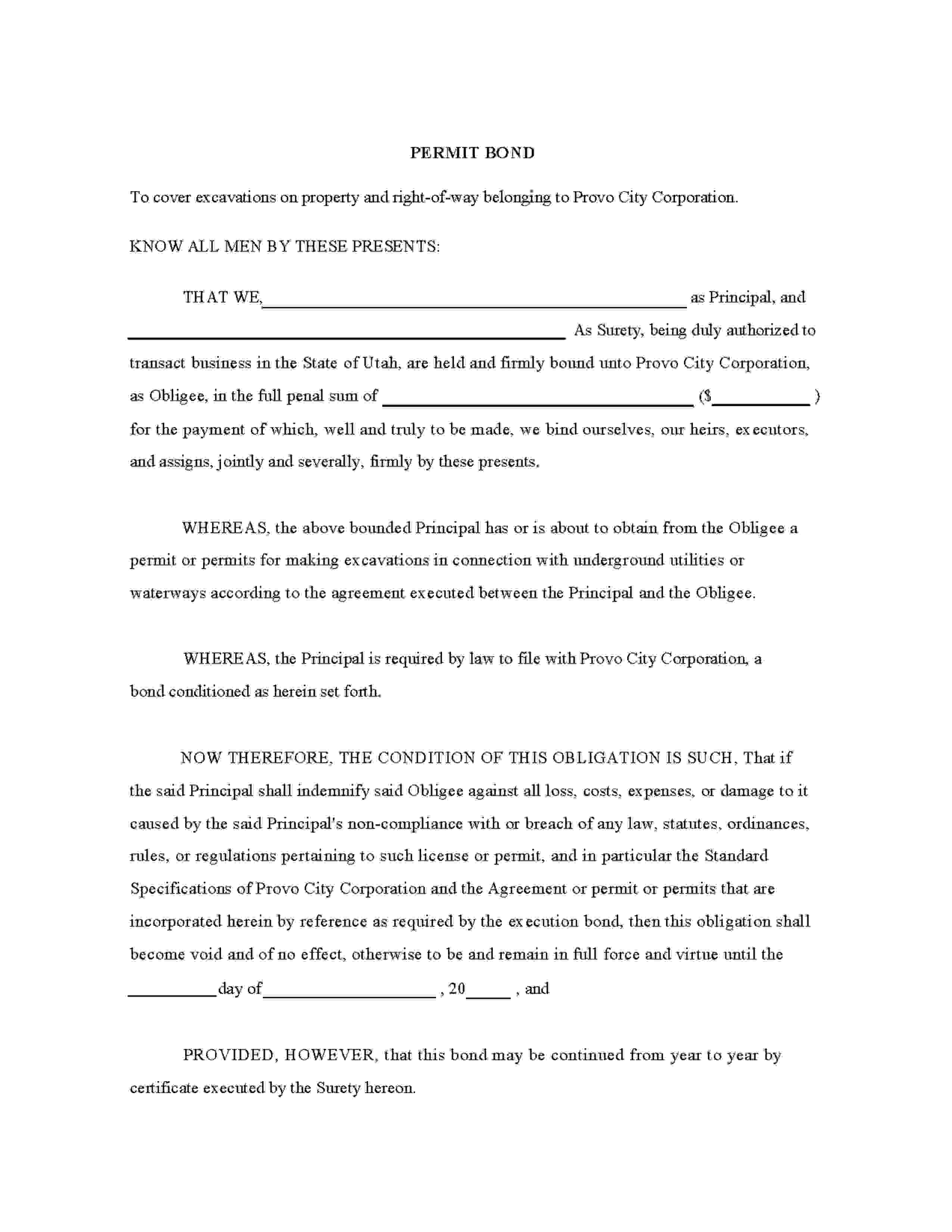 Provo City Corporation Excavation Permit Bond