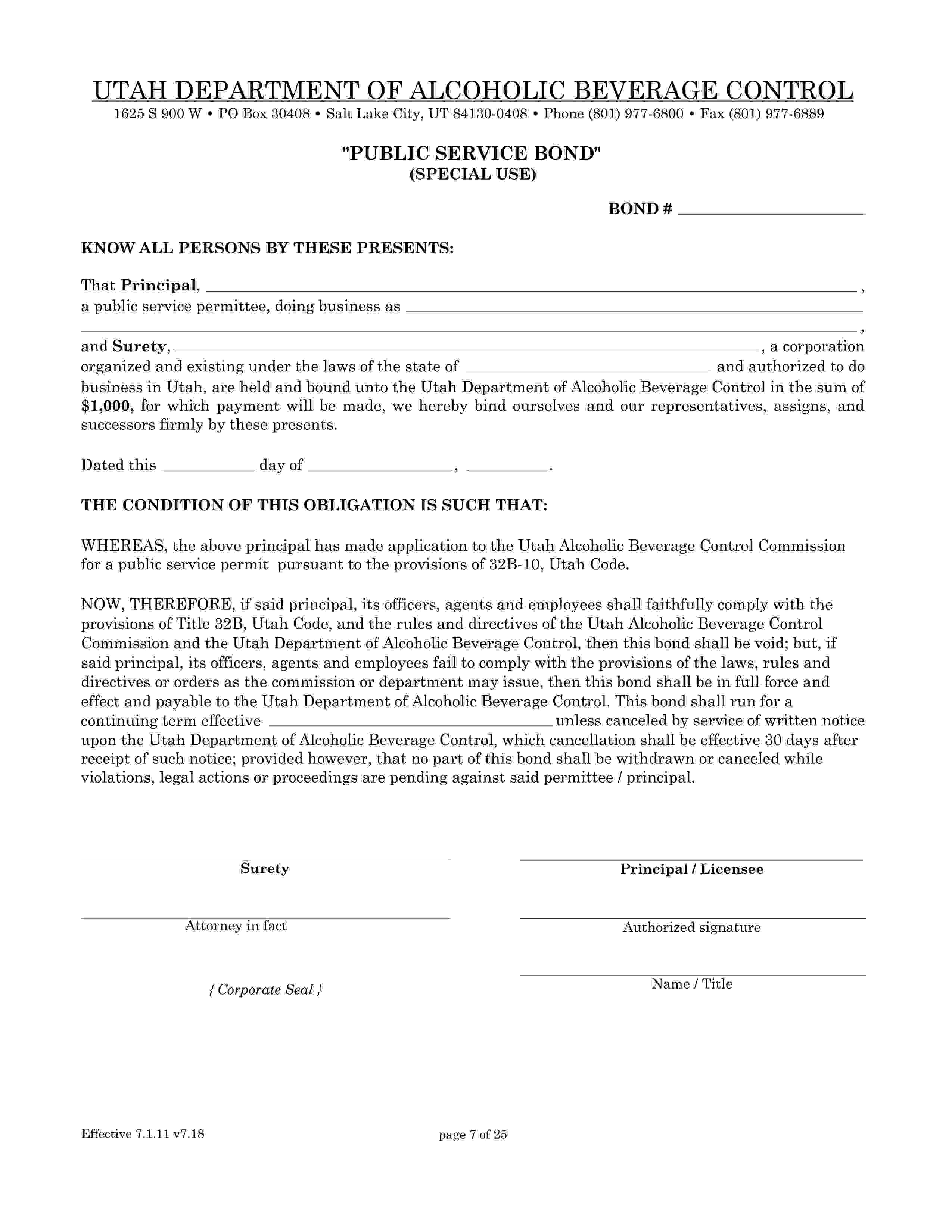 The Utah Special Use - Public Service Bond starts at $100 plus shipping costs and fees. Fill out the form to buy your bond instantly!