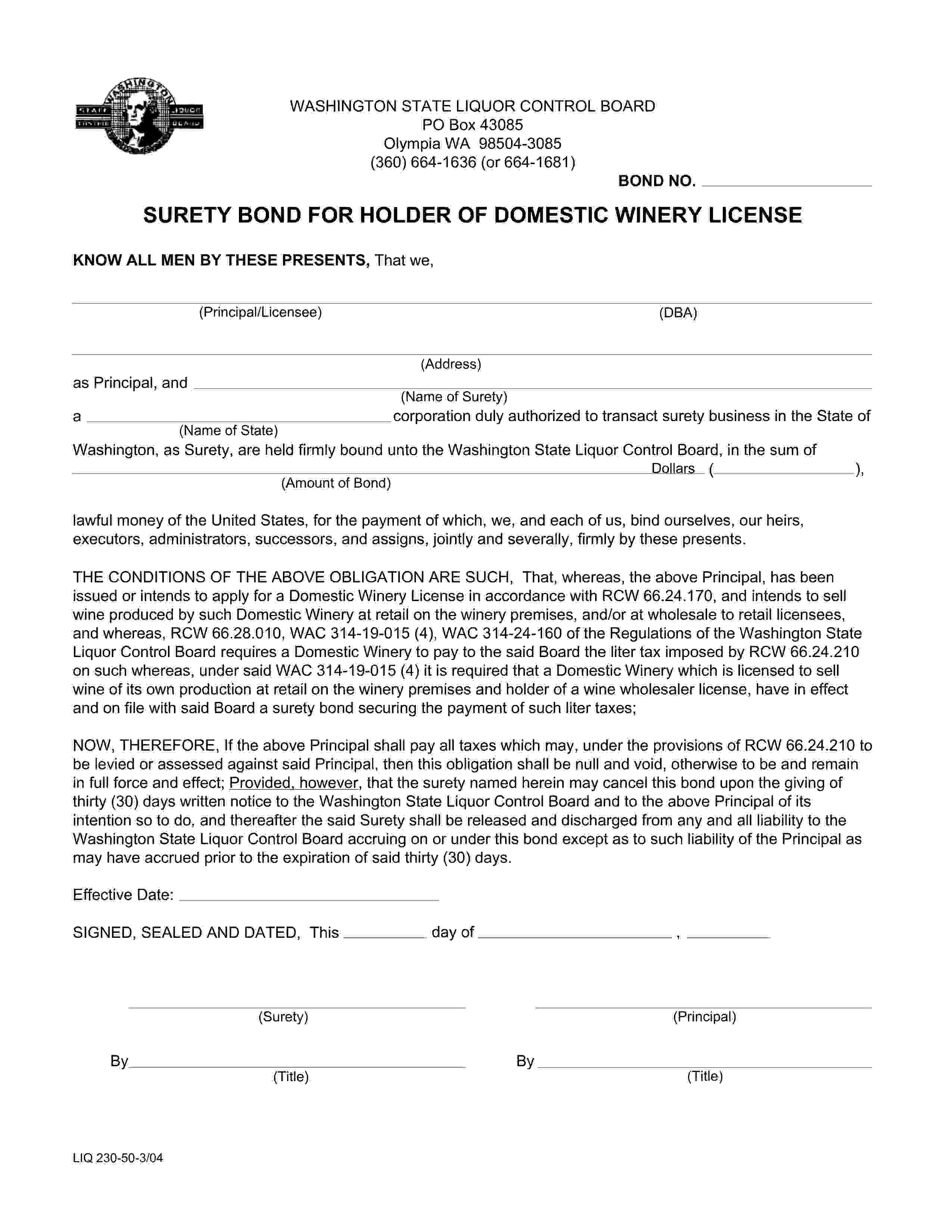 State of Washington Holder of Domestic Winery License Bond
