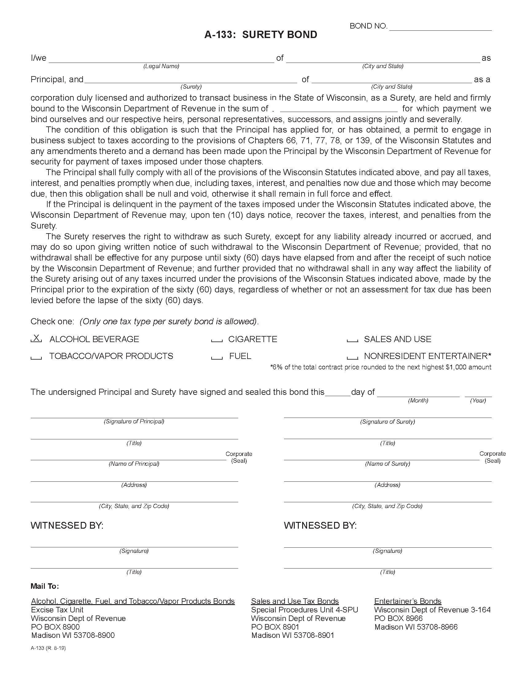 The Wisconsin Alcohol Beverage Tax Bond starts at $100 plus shipping costs and fees. Fill out the form to buy your bond instantly!