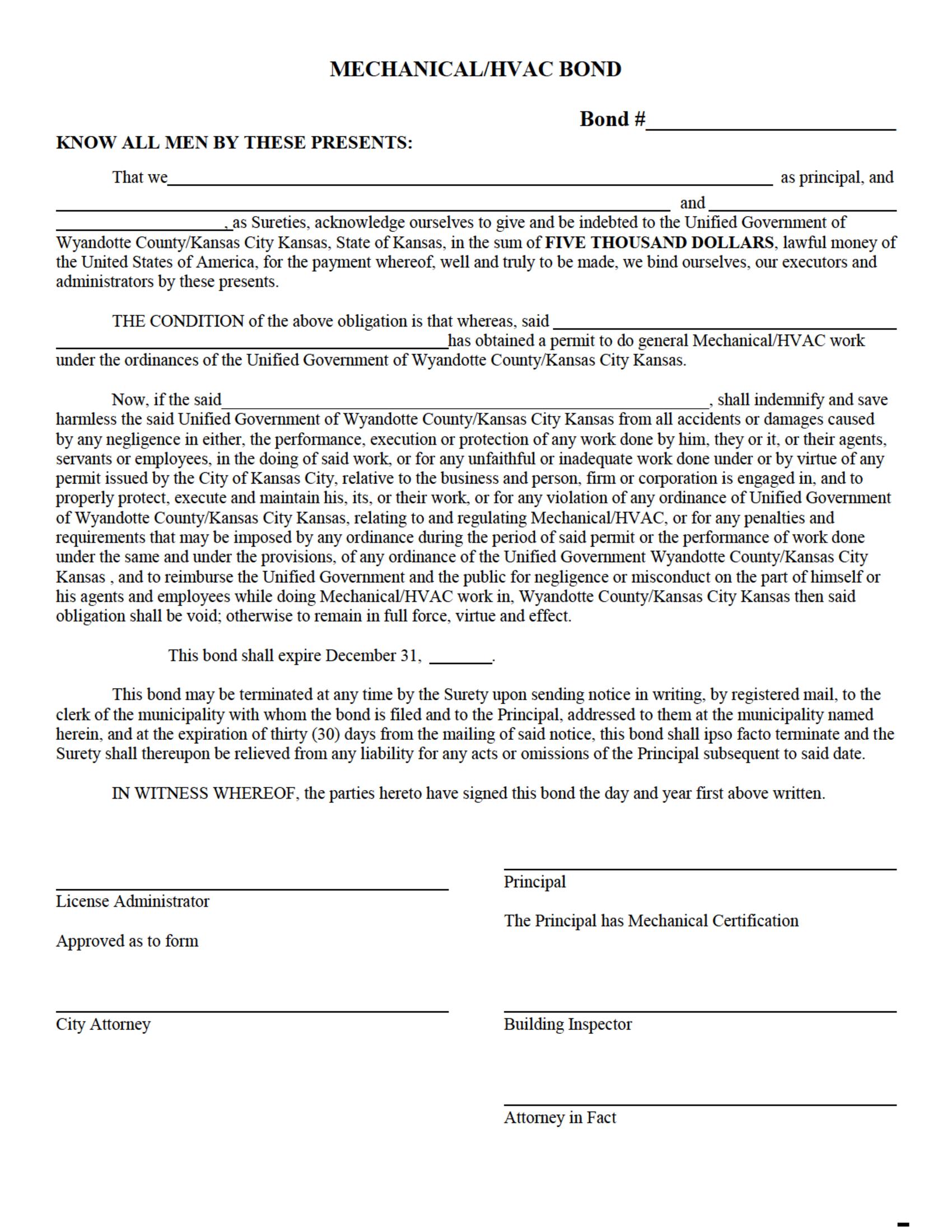 City of Kansas City Mechanical/HVAC Contractor Bond