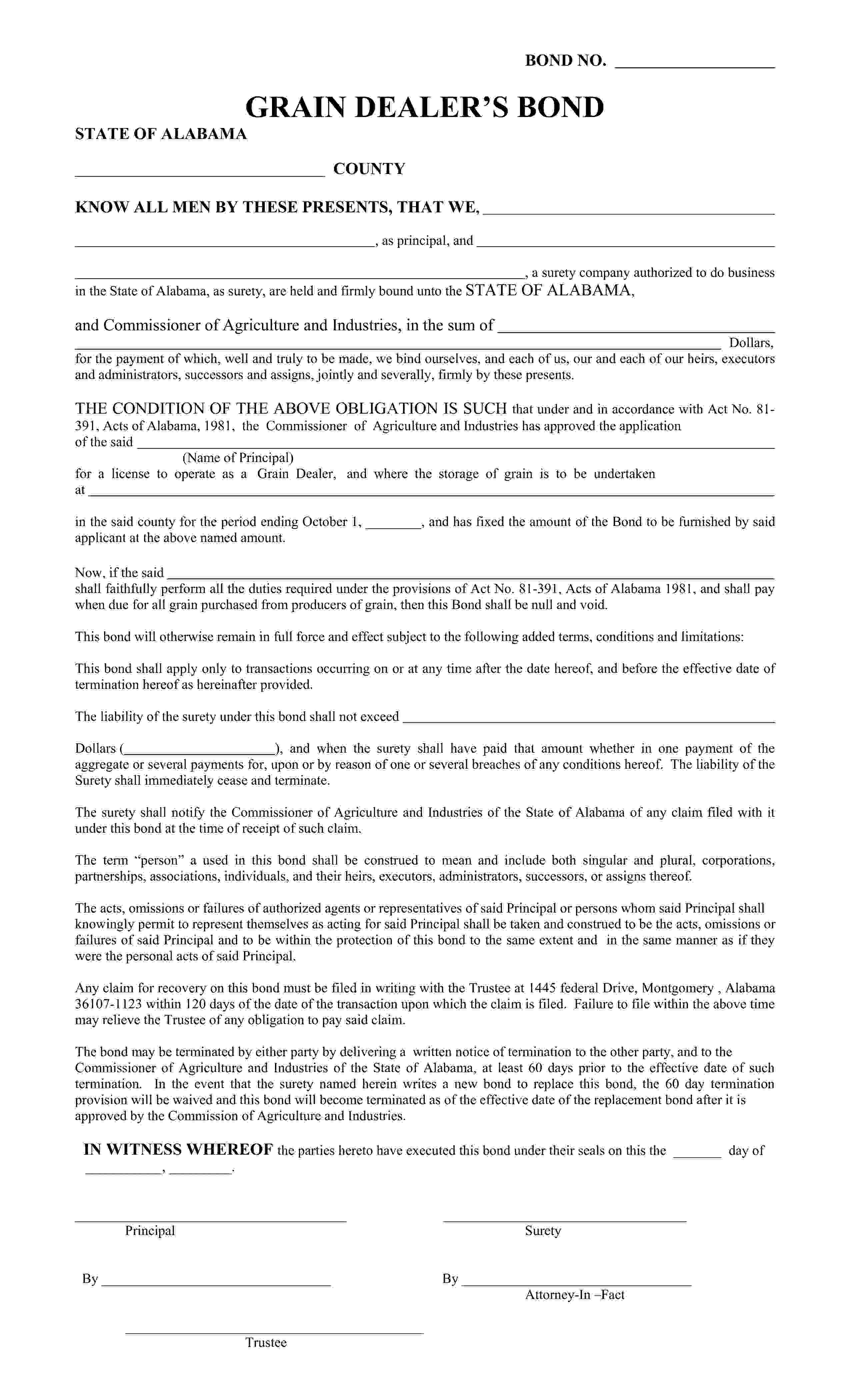 The Alabama Grain Dealer Bond starts at $100 plus shipping costs and fees. Fill out the form to buy your bond instantly!