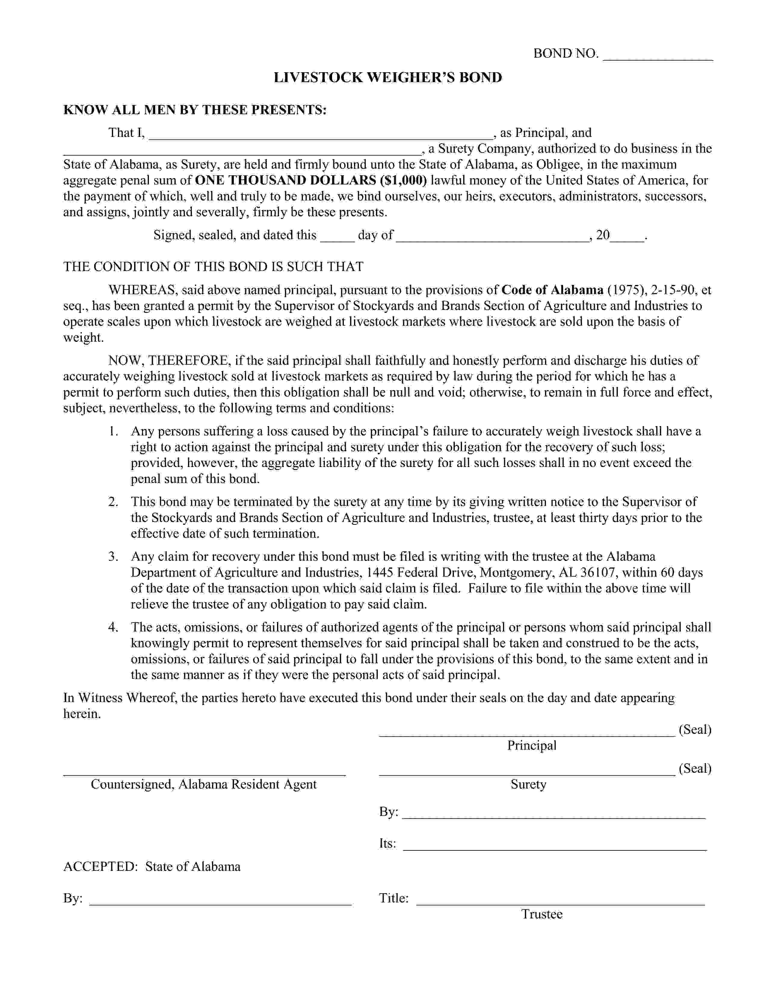 The Alabama Livestock Weigher's Bond starts at $100 plus shipping costs and fees. Fill out the form to buy your bond instantly!