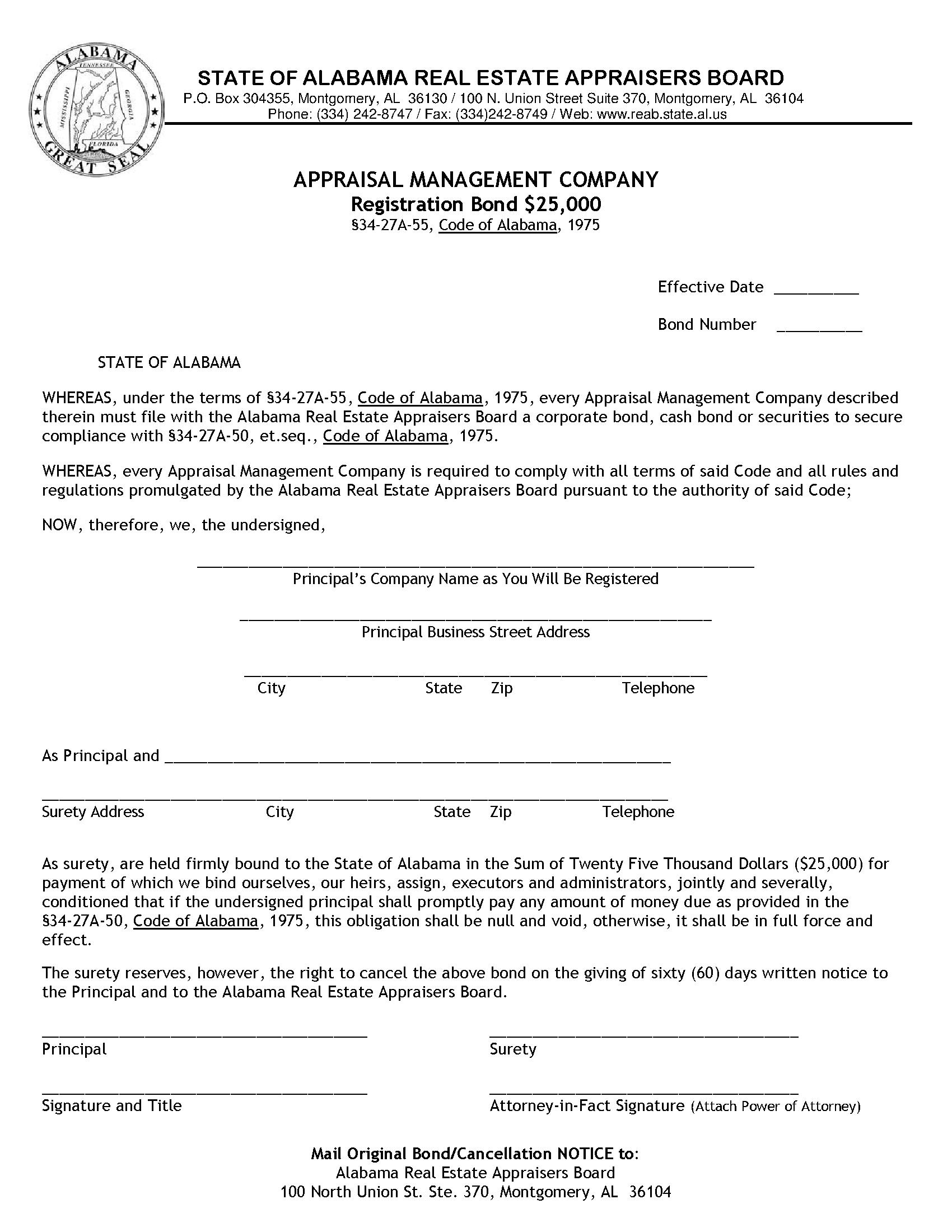 The Alabama Appraisal Management Company Bond starts at $225 plus shipping costs and fees. Fill out the form to buy your bond instantly!