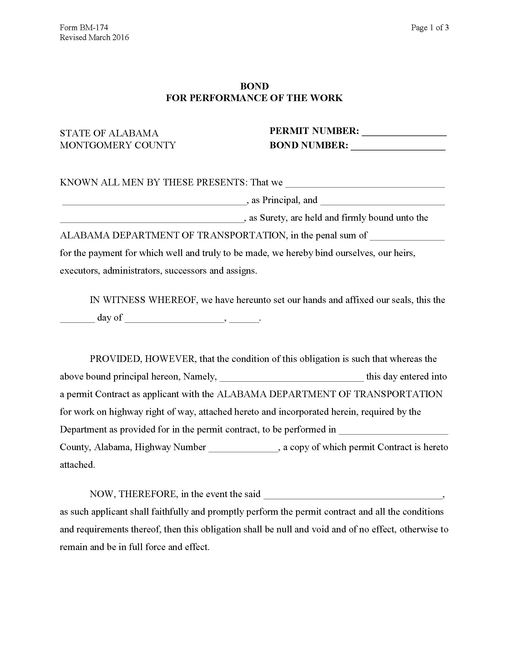 The Alabama Highway Right of Way Permit / Performance of the Work Bond starts at $100 plus shipping costs and fees. Fill out the form to buy your bond instantly!