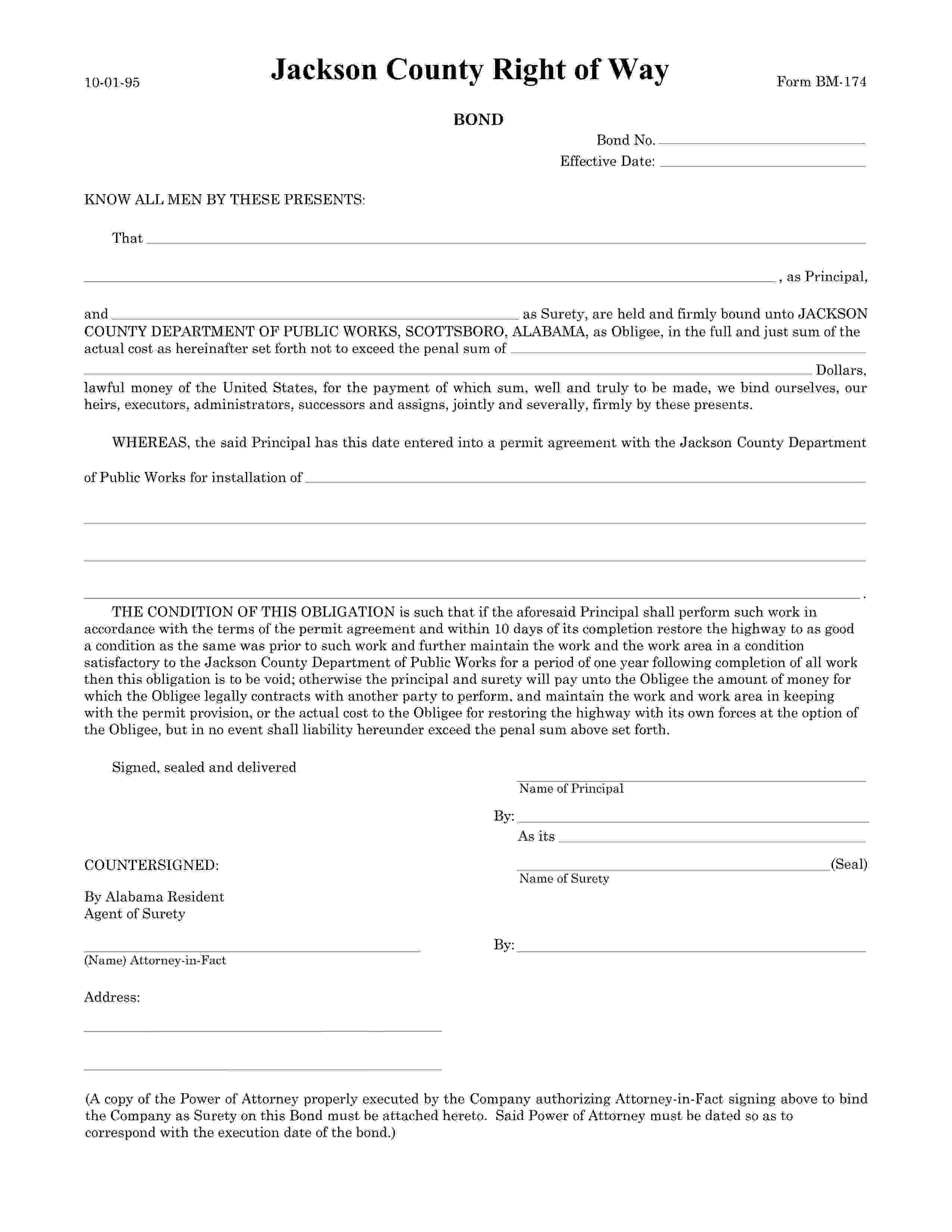 The Alabama Jackson County Department of Public Works Jackson - County Right-of-Way Bond starts at $100 plus shipping costs and fees. Fill out the form to buy your bond instantly!