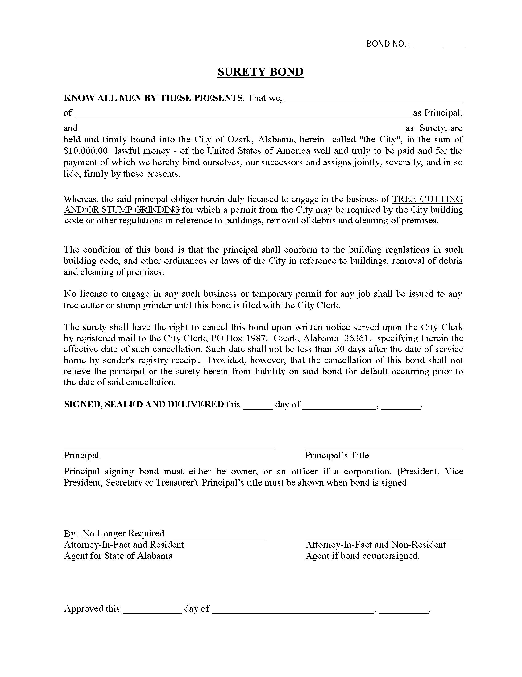 The Alabama City of Ozark Tree Cutting and/or Stump Grinding Bond starts at $100 plus shipping costs and fees. Fill out the form to buy your bond instantly!