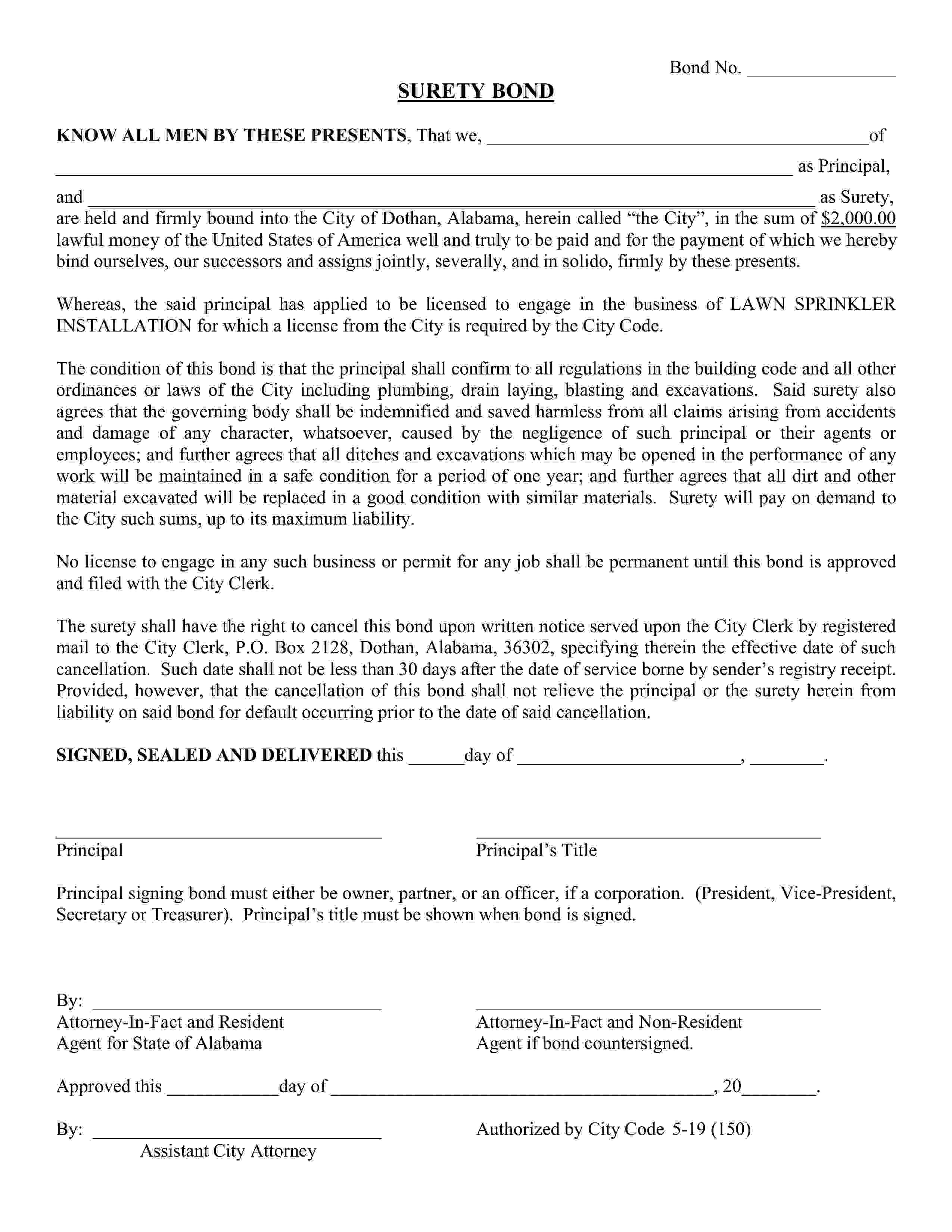 The Alabama City of Dothan Lawn Sprinkler Installation Bond starts at $100 plus shipping costs and fees. Fill out the form to buy your bond instantly!