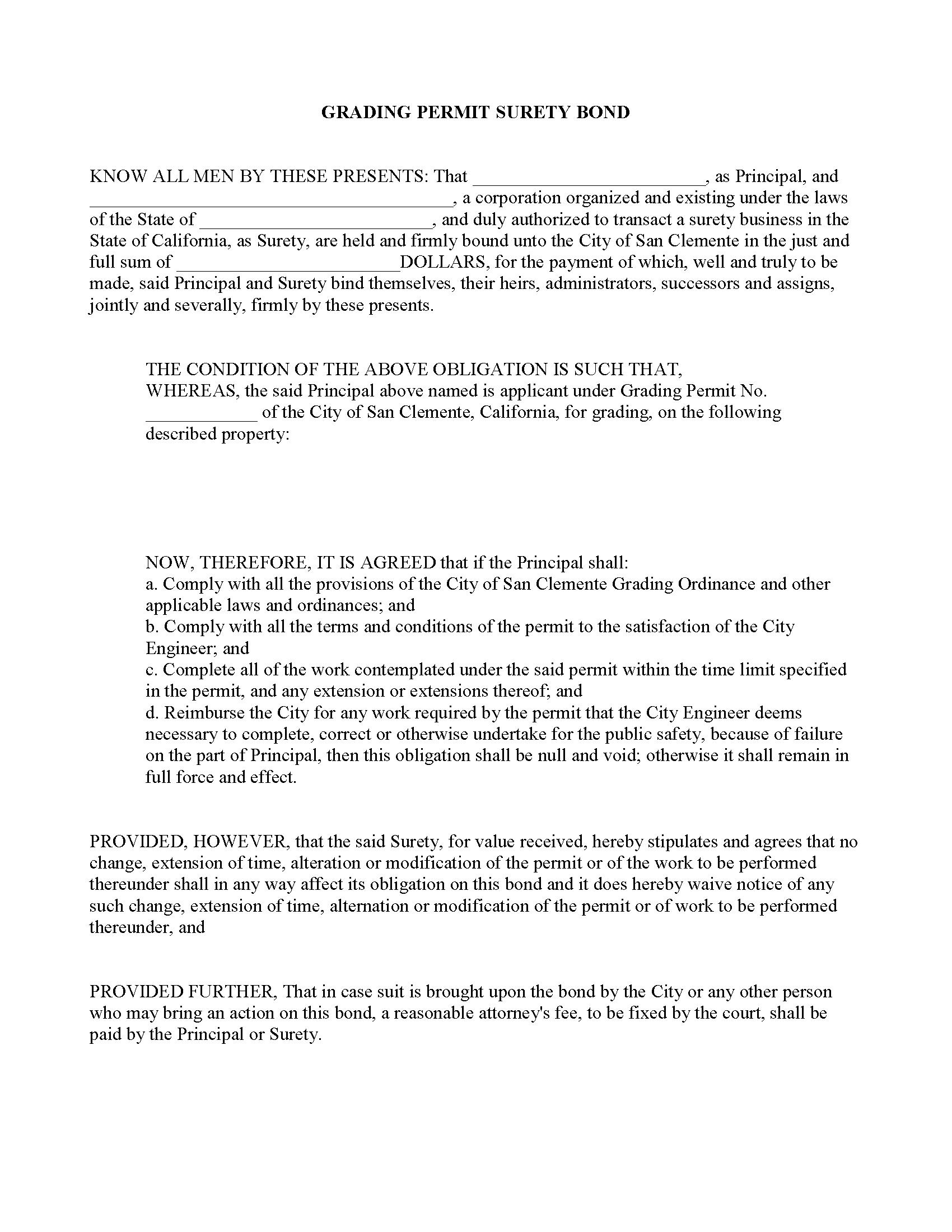 The California City of San Clemente Grading - Earthwork - Site Restoration Bond starts at $100 plus shipping costs and fees. Fill out the form to buy your bond instantly!