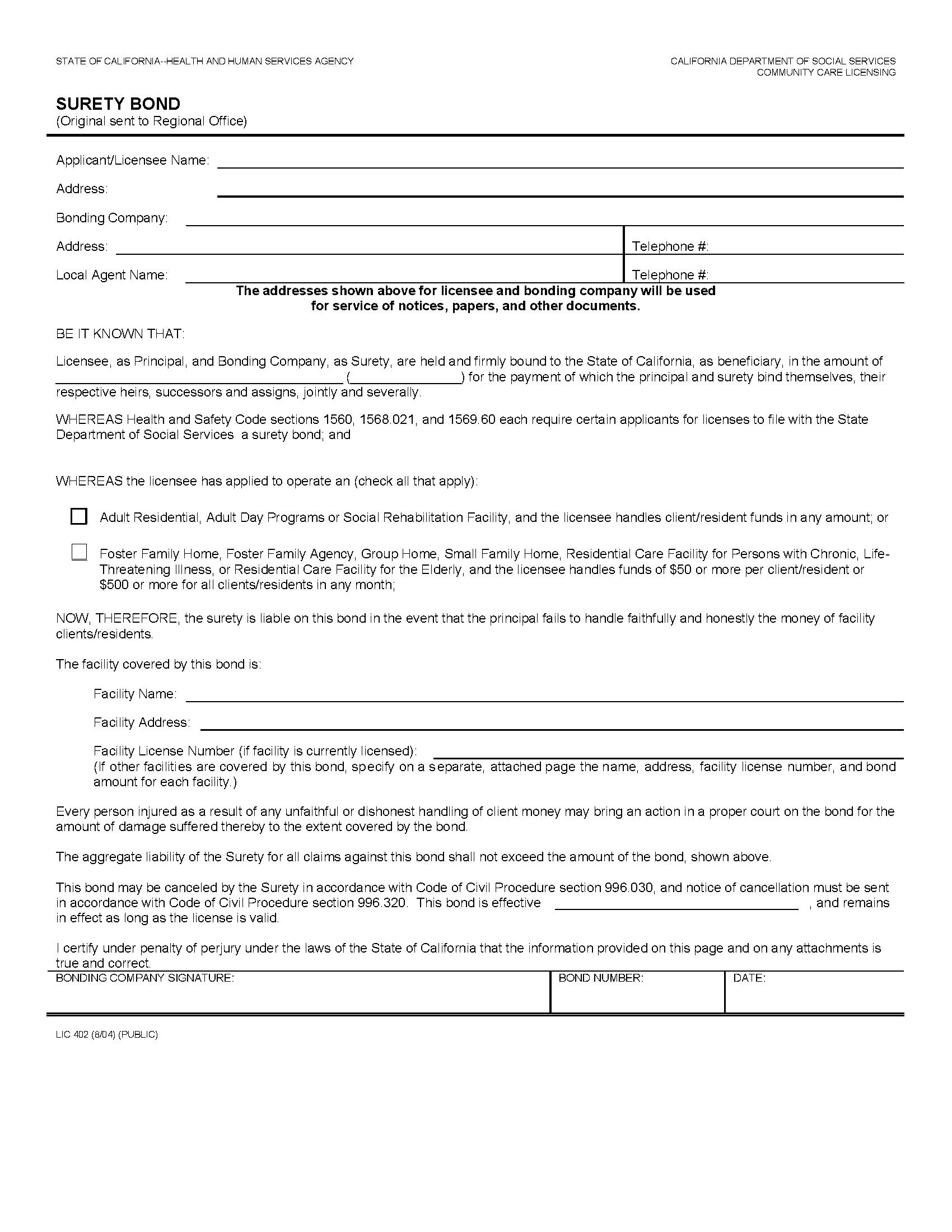 The California Community Care Licensing: Adult Residential, Adult Day Programs or Social Rehabilitation Facility Bond starts at $100 plus shipping costs and fees. Fill out the form to buy your bond instantly!