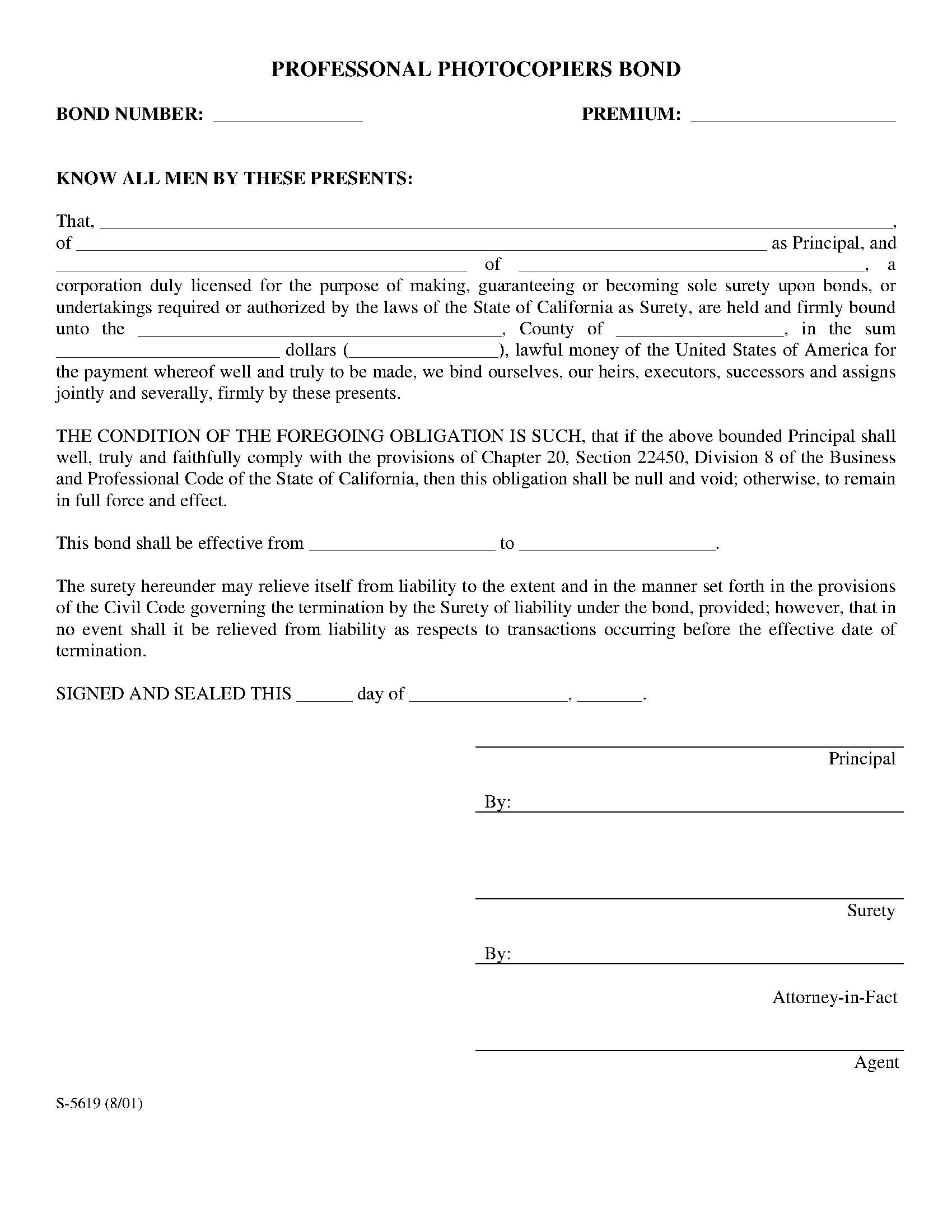 The Professional Photocopier Bond starts at $175 plus shipping costs and fees. Fill out the form to buy your bond instantly!
