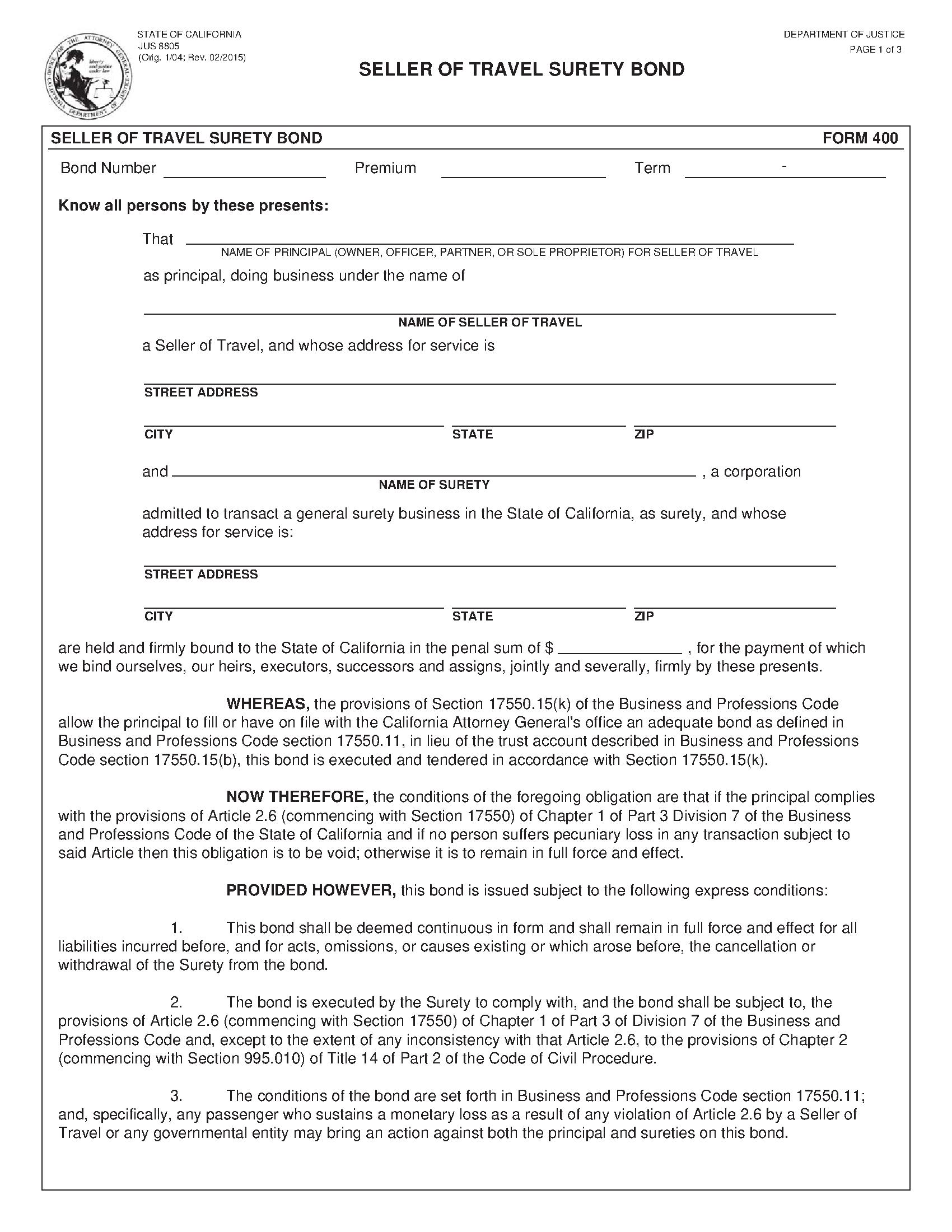 The California Seller of Travel Bond starts at $100 plus shipping costs and fees. Fill out the form to buy your bond instantly!