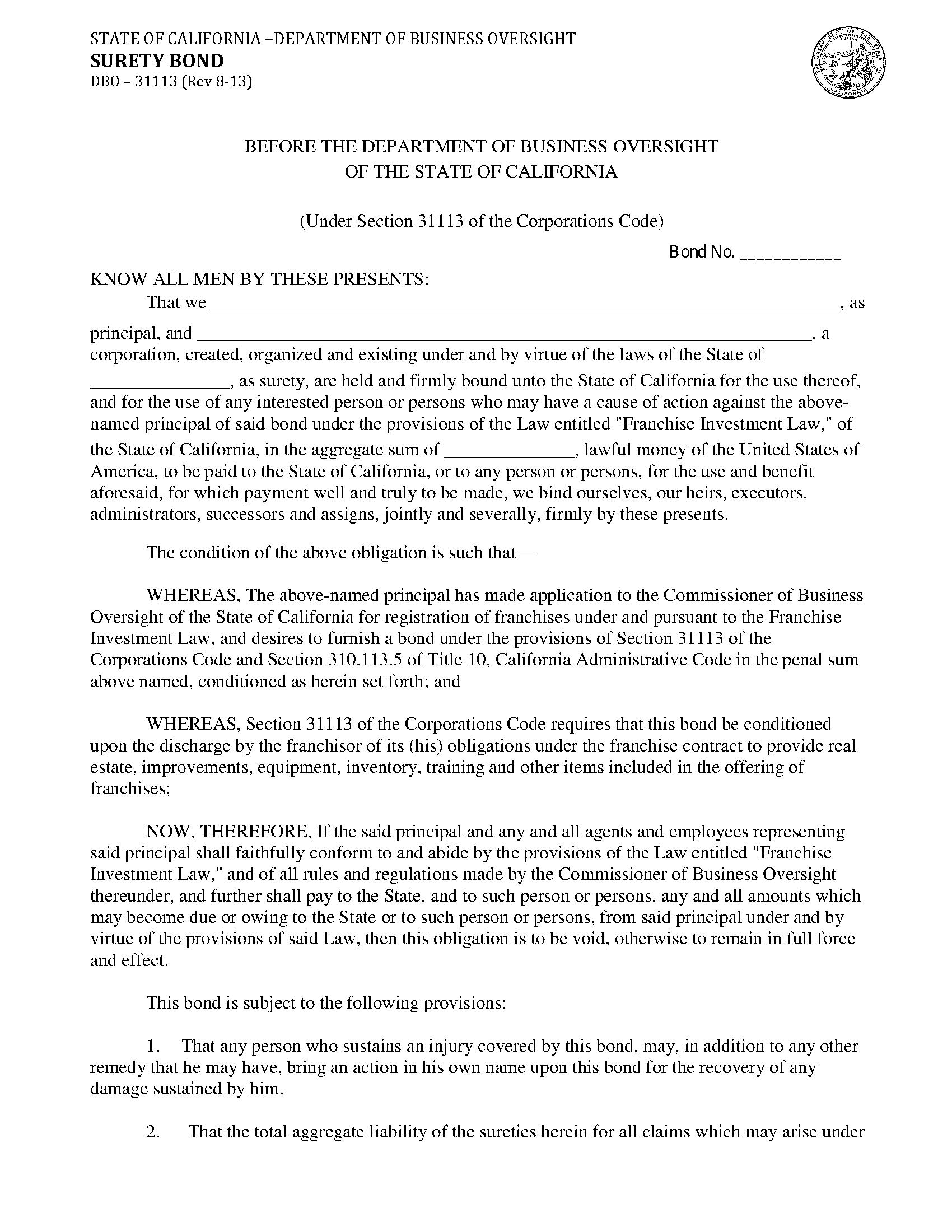 The California Franchise Registration Bond starts at $100 plus shipping costs and fees. Fill out the form to buy your bond instantly!