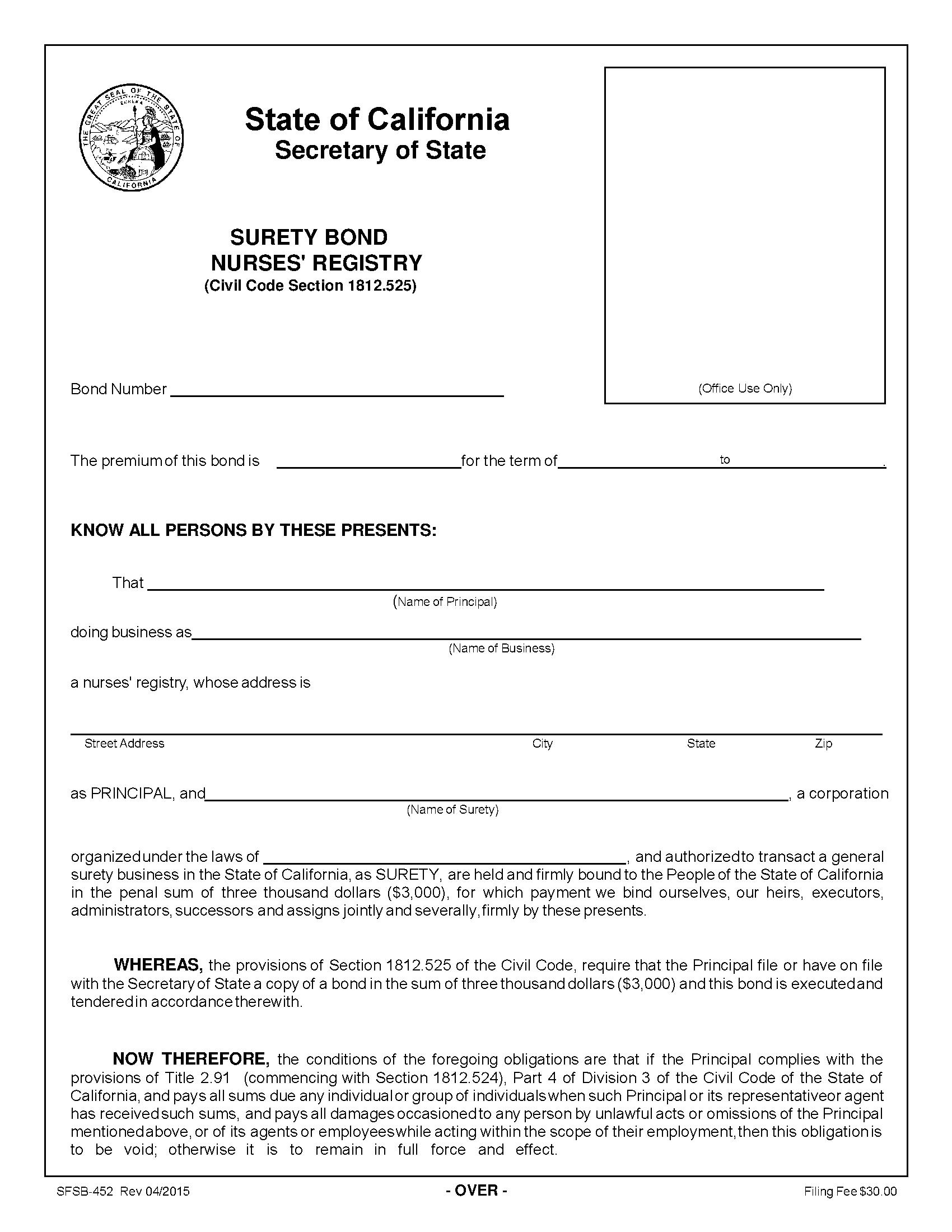 The California Nurses Registry Bond starts at $175 plus shipping costs and fees. Fill out the form to buy your bond instantly!